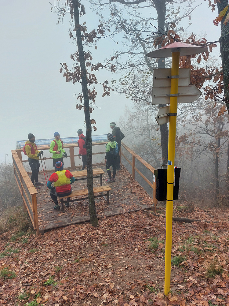 Nohy si potom na chvíľu uľavili na asfalte a bruchá čakalo prekvapenie – poľná občerstvovačka pod lesom, pod ďalším z výnimočných bodov trasy. A tým bola nová vyhliadková plošina Vínny vrch, zmontovaná miestnymi turistami na bralku nad Lupočou. Takmer najjužnejší bod trasy, ku ktorému bolo treba vyštverať sa fajne strmo, po chodníku lesom. Akurát, že výhľady len do plnotučného mlieka - našťastie panoramatická fotka s popismi trochu pomohla. Do Maďarska len na skok.