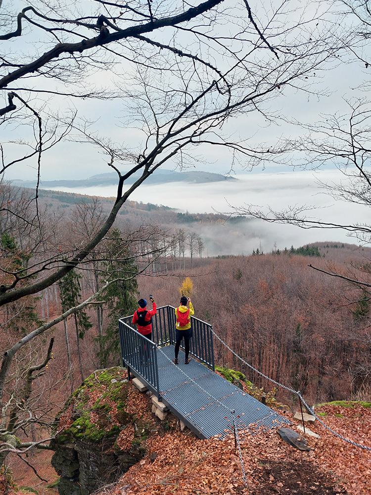A z Tuhára zas hore brehom – po Timraviných chodníčkoch, až hore na „hrebeňovku“, dlho a stále strmšie, na konci dokonca aj s pomocou reťazí pod andezitovým bralom. Pod skalou malá jaskyňa, na skale prístrešok a o kúsok vedľa ďalšia nová vyhliadková plošina. Výhľad by bol na východ, nebyť toho mlieka.