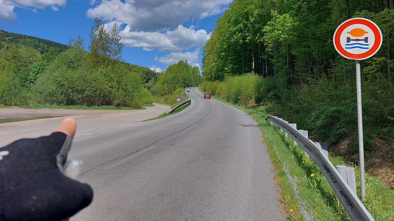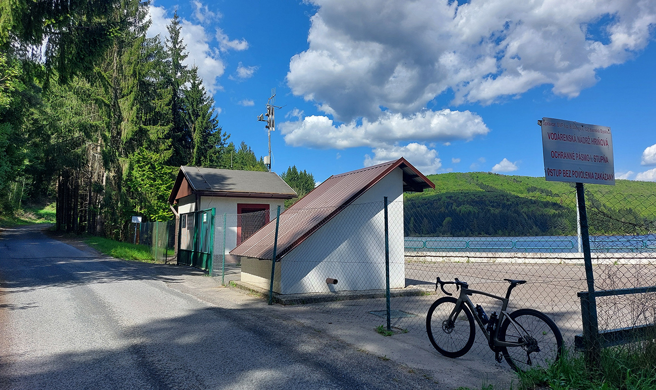 Potom dlhšia rovinka v tieni lesa, popri západnom brehu nádrže. Asfalt dobrý, občas posypom zahádzaný, občas nejaká tá nevinná jama. V úzkych zákrutách, za ktoré nevidno, treba dávať pozor na miestnych „rally jazdcov“.