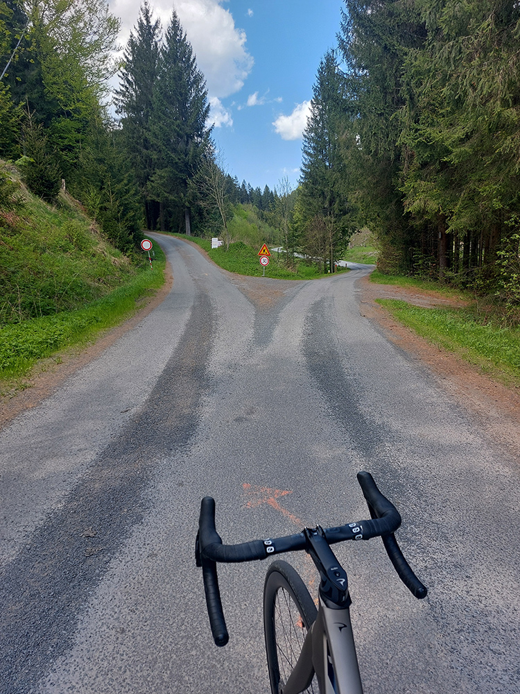 Druhý raz sa to dvihne na križovatke: Poľana doľava, doprava Snohy. Potom sa sklon už drží stabilne okolo 10%, často aj cez. Až po tú spomínanú križovatku, to sú nejaké dva kiláky – len kúsok pod ňou sa trochu zmierňuje. Tu je asfalt starší, ale stále dobrý, opravené sú len mostíky a priepusty: