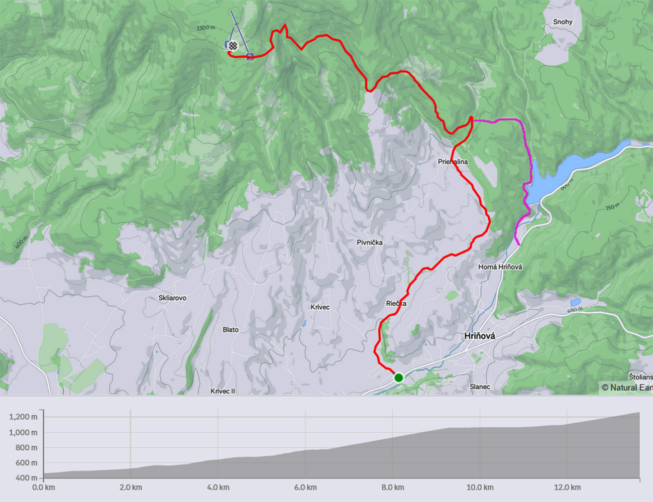 Kto ide hore od nádrže, je to kratšie (10.5 km), ale na začiatku strmšie. Z hlavnej treba za horným koncom Hriňovej odbočiť doľava na Sklársku ulicu, pretrpieť pár stoviek metrov poplátanej asfaltky jemne dole kopcom pomedzi domy a pri autobusovej zastávke sa to dvihne prvý raz. A poriadne ostro, veď ako na hrádzu nádrže. Zo 500 metrov a do 12%: