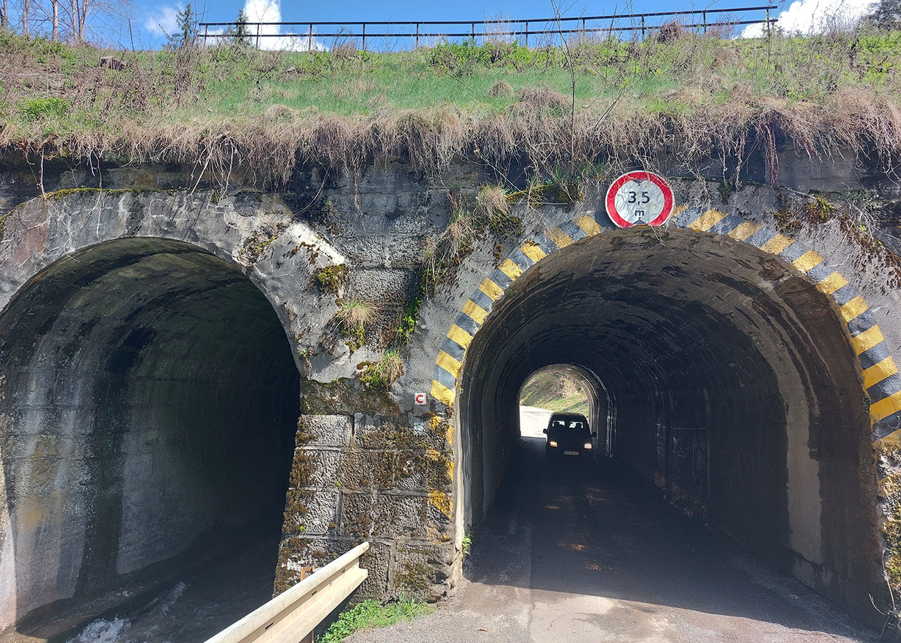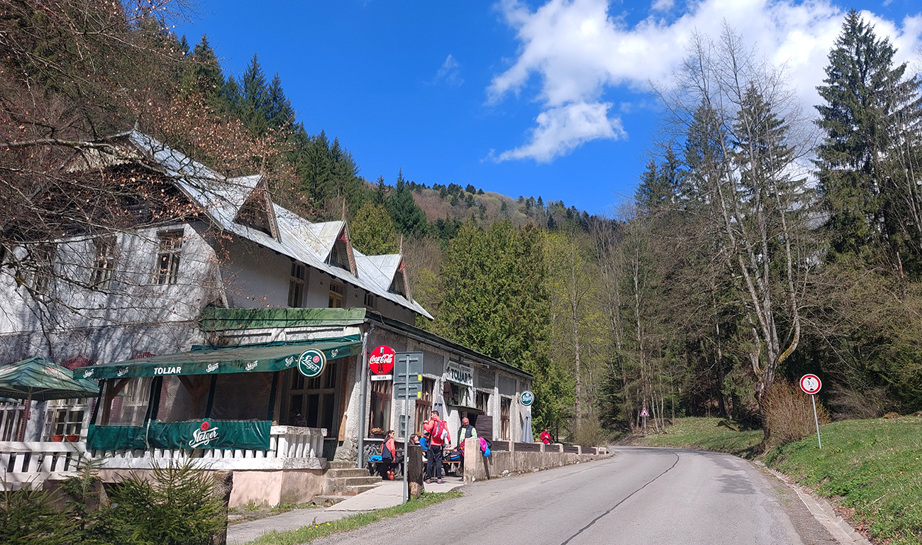 Cesta sa postupne rozširuje a prechádza popri reštaurácii Toliar aj s terasou, takže bike friendly. Len je tá terasa priamo pri ceste. Hneď za zákrutou pre zmenu najužšie miesto na trase, ako cesta prechádza tunelom popod železnicu. Tam je aj najhorší asfalt na trase, tých pár metrov je navyše v poriadnej tme: