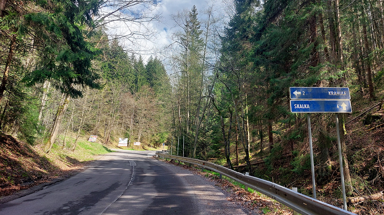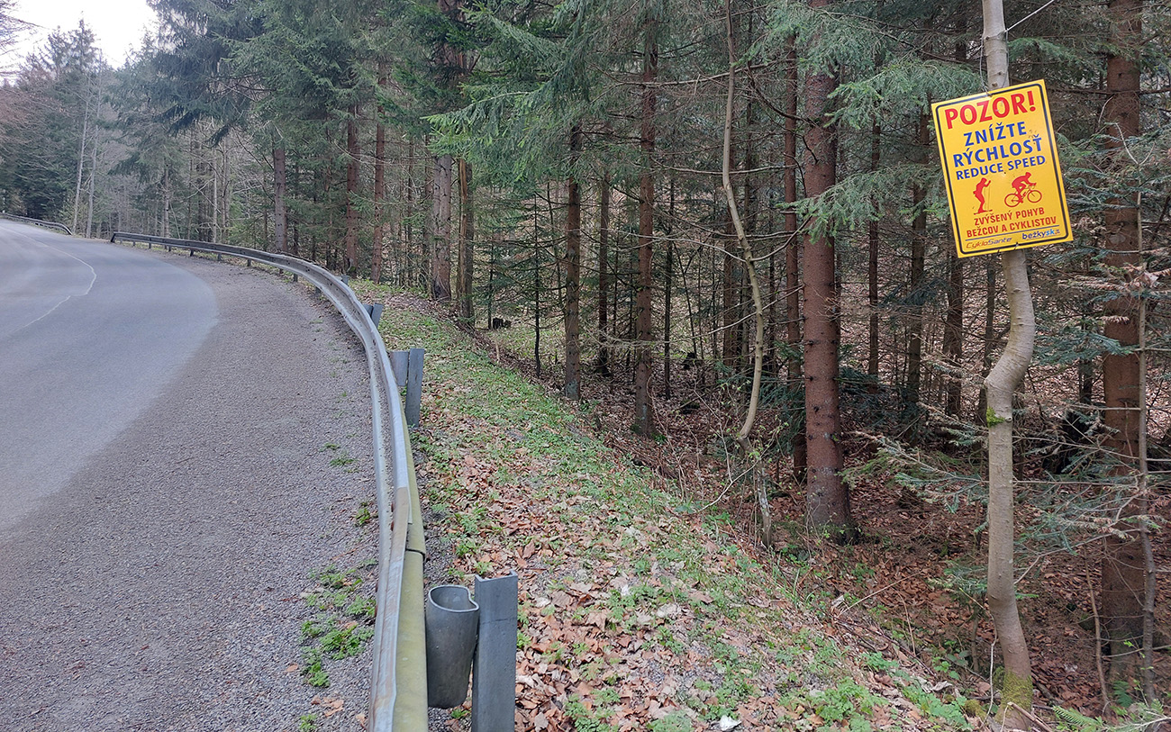 Za odbočkou na Krahule sa cesta ešte rozšíri a spestrujú ju miestne tabule, poriadne výrazné, upozorňujúce vodičov, cyklistov a bežkárov na seba navzájom. Povrch už hladký ako detská ritka.
