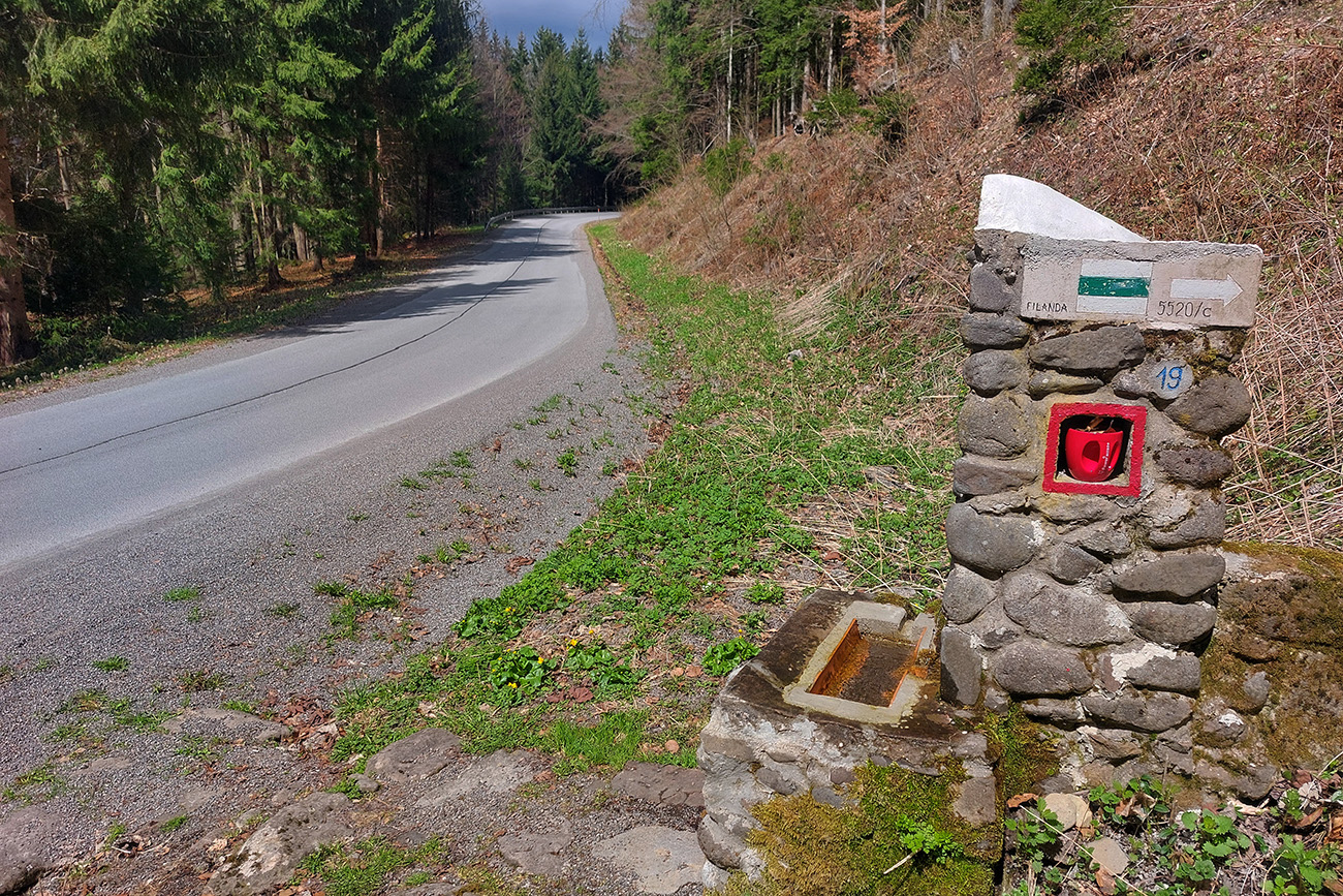 Na siedmom kiláku cesta serpentínou doľava opúšťa dolinu a mieri viac na sever, traverzom. Ubúda tieňa, ale už je to vyššie, aj v lete sa to dá vydržať, slnko suší mokrý chrbát. A hneď na zákrute je pre zúfalcov ďalší prameň – jeden z tých početných „filandovských“.