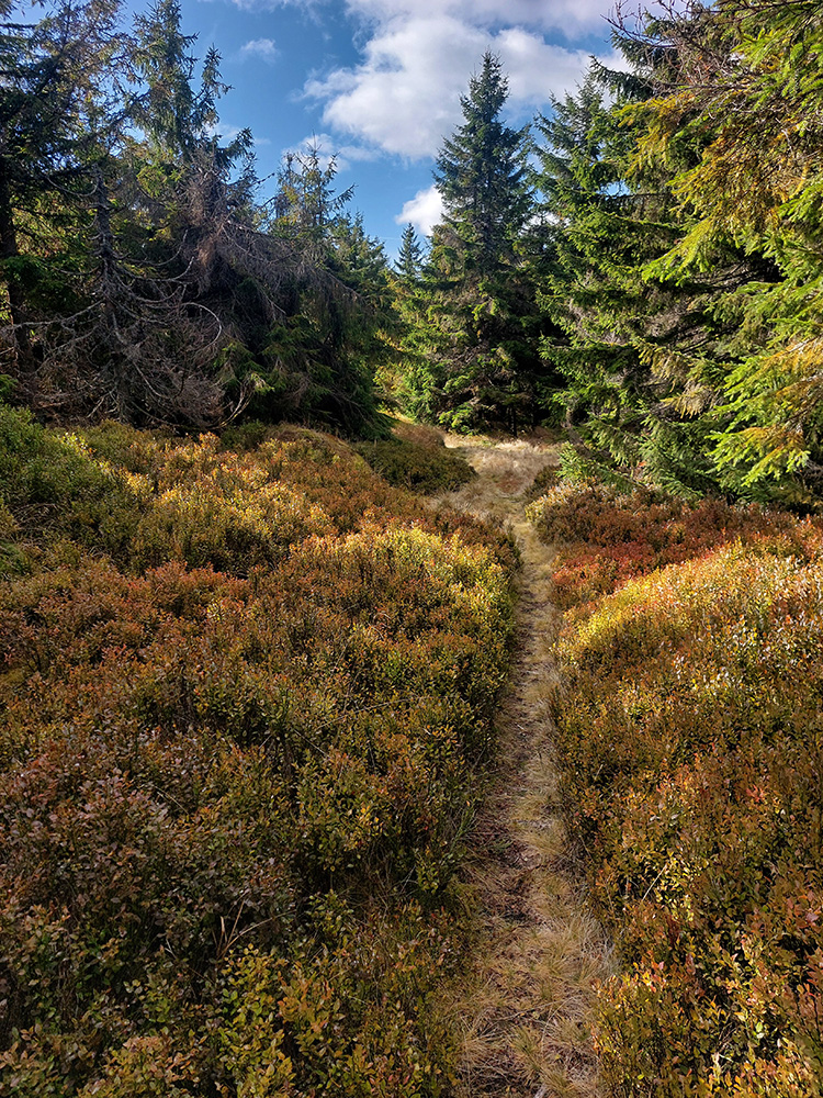 Prvá etapa od vlaku cez dedinu a popod lom do doliny Čiernej vody, ponad vodárenskú nádrž, popri chate Obrázok a Dirhabské sedlo až po zelenú značku pod sedlom Tunel bola ozaj výlučne po zvážniciach. Boli aj „strade bianche“, aj nejaký ten asfalt, aj mäkké, machom a ihličím vystlané cesty, všeeetko možné, ale všetky dobré, nerozrýpané, aj pre bajk. A farby dookola sýte, radosť behať/jazdiť.