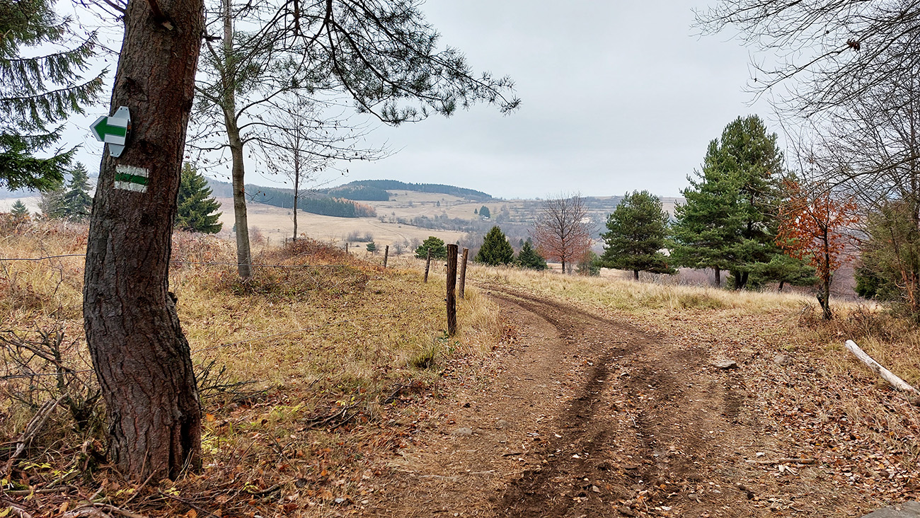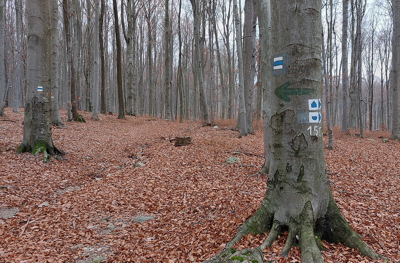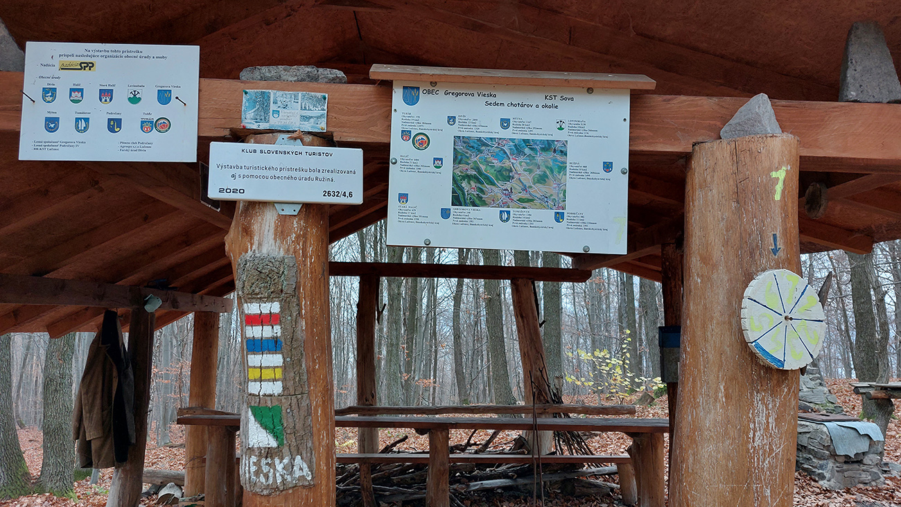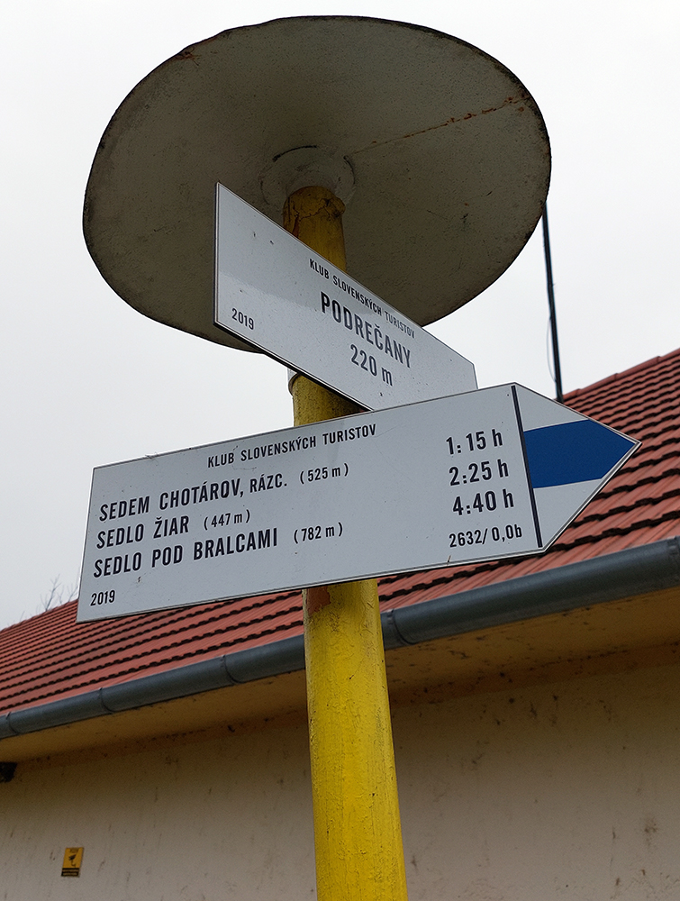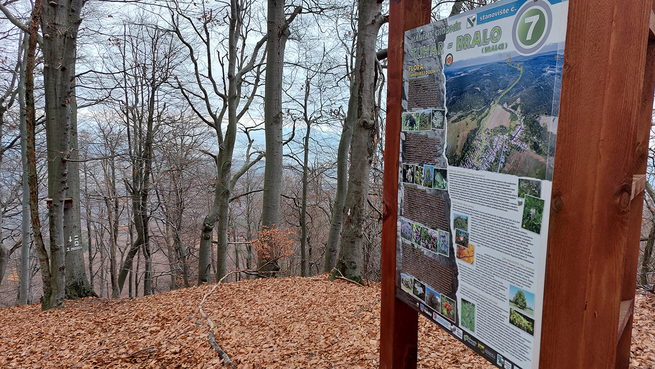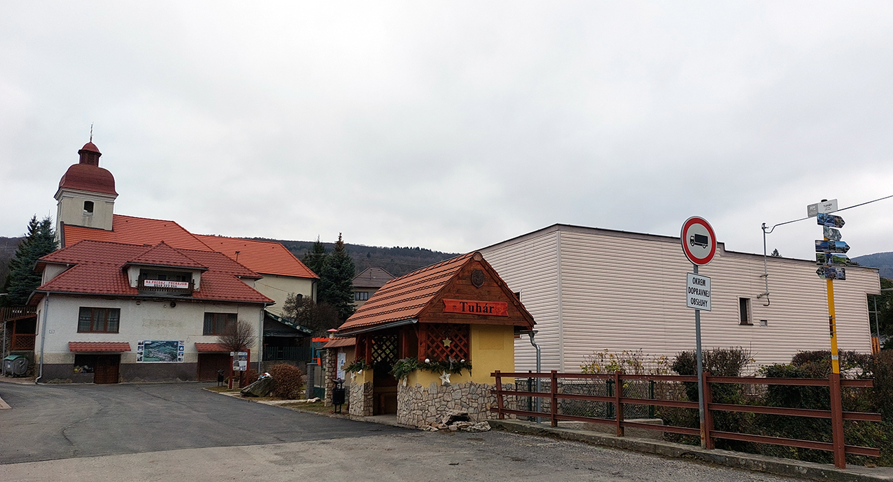 Začiatok samozrejme od vlaku. Z Podrečian do Tuhára je to takmer furt po lesných cestách, len na konci trocha po lúkach, dole do dediny. Pod nohami už hrubá vrstva lístia, na začiatku dubového, vyššie bukového. Pred polovicou tohto úseku sa chodník preklápa do klesania cez vrch s názvom Sedem chotárov. Turistický prístrešok (a iné potrebné) je tu podľa tabuliek svojpomocne zbudované ľuďmi z okolitých dedín. Smerovníkov a šípiek na mrte, hádam všetky farby. Na Orave sú Štyri chotáre, tu že by sa ich až sedem zišlo v jednom bode? Nooo, je okolo toho kopca aj viac ako sedem dedín naukladaných, ale pri detailnom pohľade do katastrálky vidno, že chotárov (katastrálnych území) sa hore zbieha len šesť. A navyše je to tuhárske trochu „bokom odskočené“. Ale nevadí. Výhľady inak cestou žiadne, ani do Tuhára nevidno, len pár priehľadov cez rúbane sa naskytne. Zato rachot z kameňolomu sa poriadne ozýva, aj keď je nedeľa. To je ten, kde sa už od 19. storočia ťaží známy tuhársky mramor.