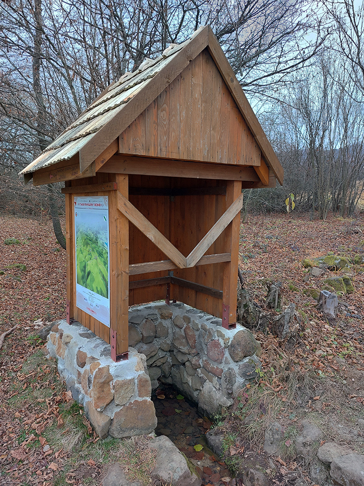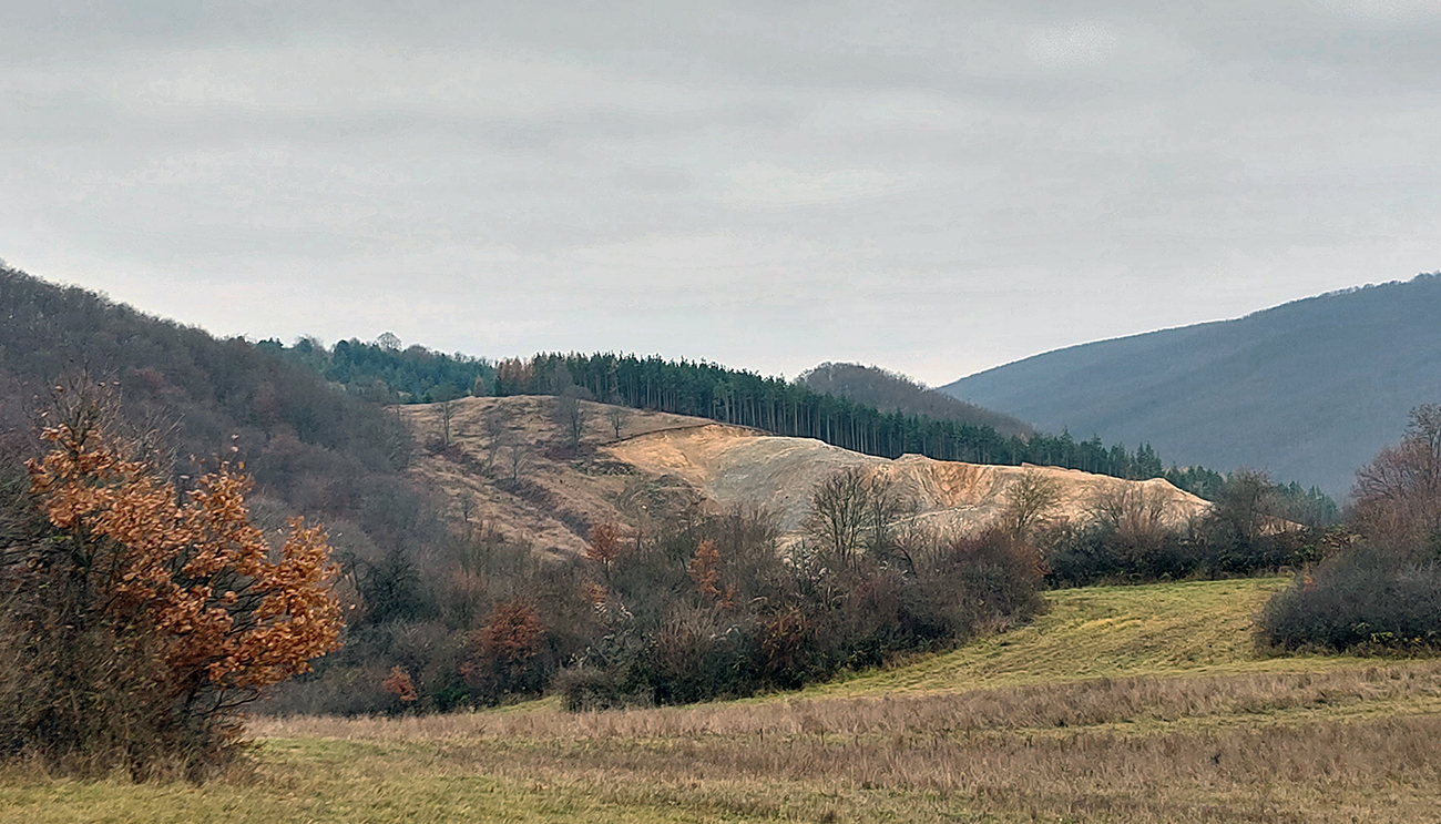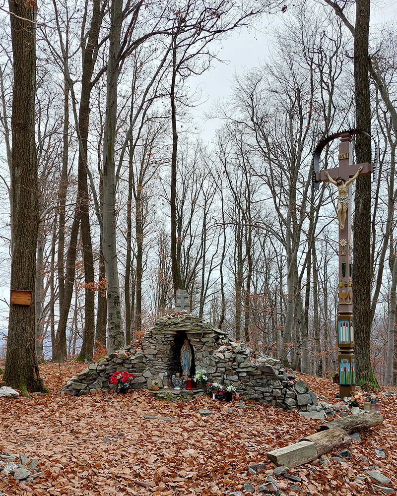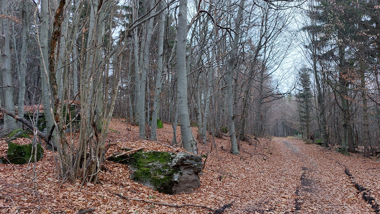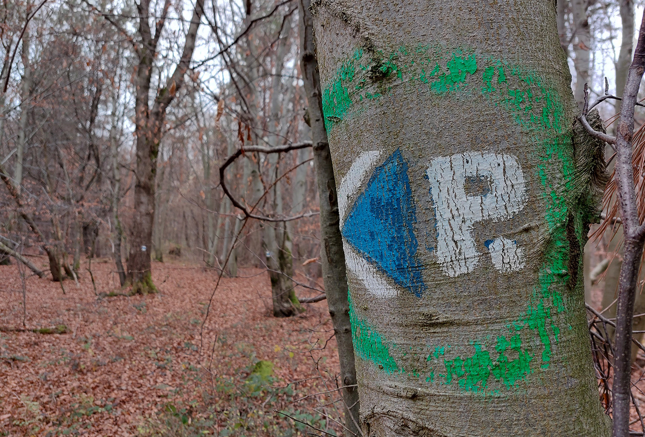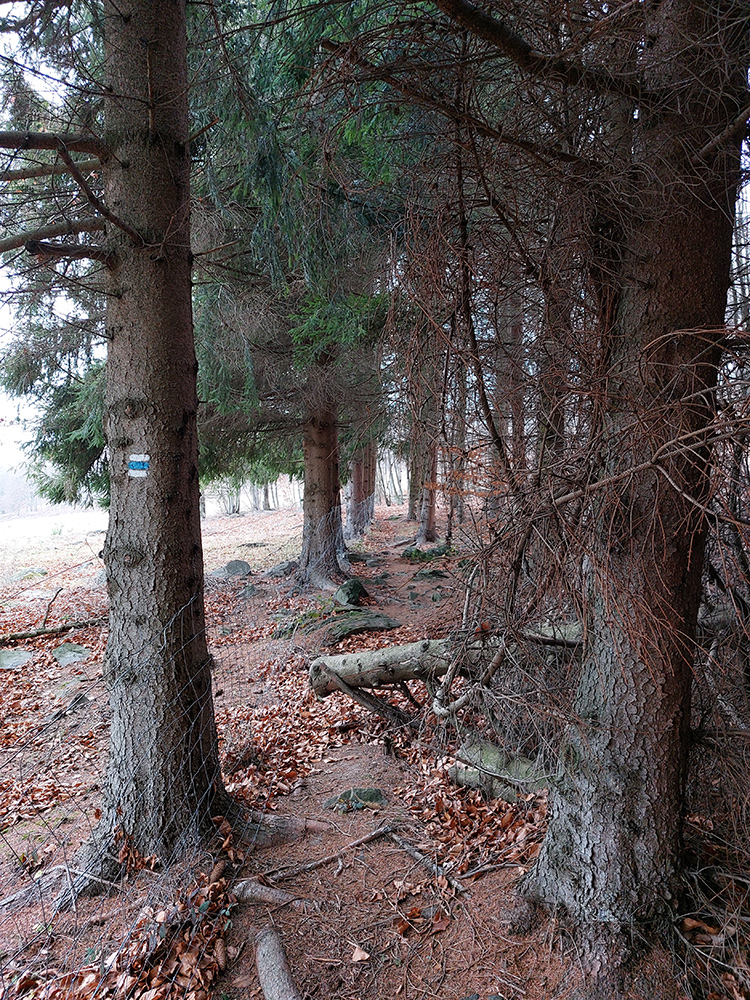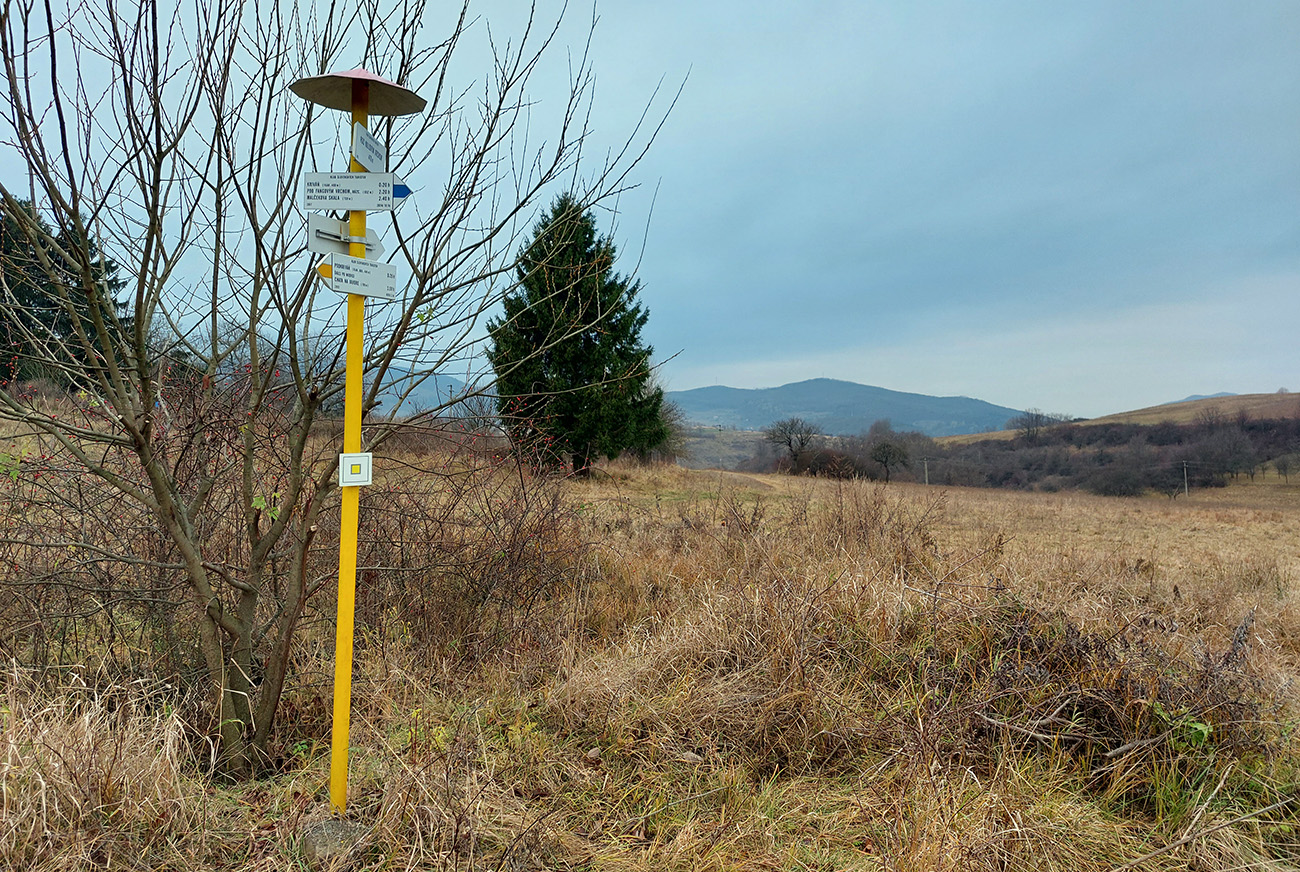 Začiatok samozrejme od vlaku. Z Podrečian do Tuhára je to takmer furt po lesných cestách, len na konci trocha po lúkach, dole do dediny. Pod nohami už hrubá vrstva lístia, na začiatku dubového, vyššie bukového. Pred polovicou tohto úseku sa chodník preklápa do klesania cez vrch s názvom Sedem chotárov. Turistický prístrešok (a iné potrebné) je tu podľa tabuliek svojpomocne zbudované ľuďmi z okolitých dedín. Smerovníkov a šípiek na mrte, hádam všetky farby. Na Orave sú Štyri chotáre, tu že by sa ich až sedem zišlo v jednom bode? Nooo, je okolo toho kopca aj viac ako sedem dedín naukladaných, ale pri detailnom pohľade do katastrálky vidno, že chotárov (katastrálnych území) sa hore zbieha len šesť. A navyše je to tuhárske trochu „bokom odskočené“. Ale nevadí. Výhľady inak cestou žiadne, ani do Tuhára nevidno, len pár priehľadov cez rúbane sa naskytne. Zato rachot z kameňolomu sa poriadne ozýva, aj keď je nedeľa. To je ten, kde sa už od 19. storočia ťaží známy tuhársky mramor.