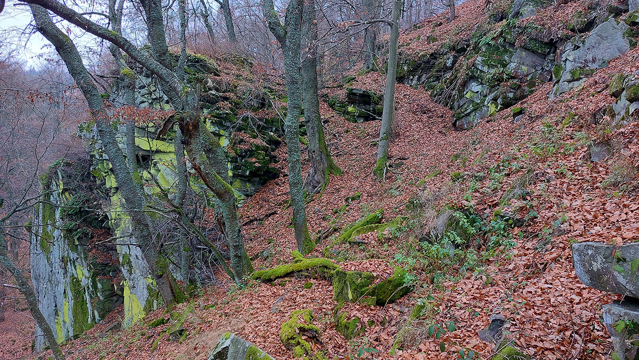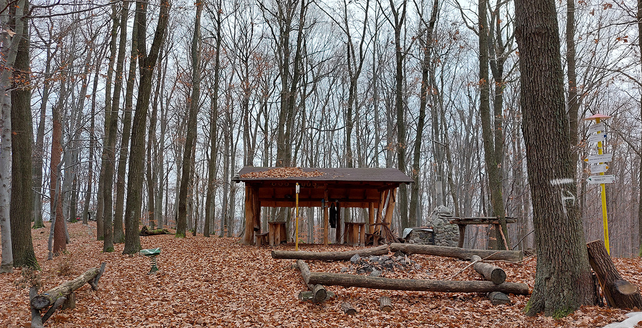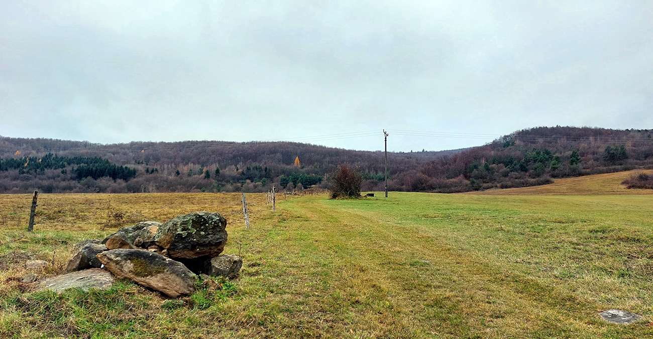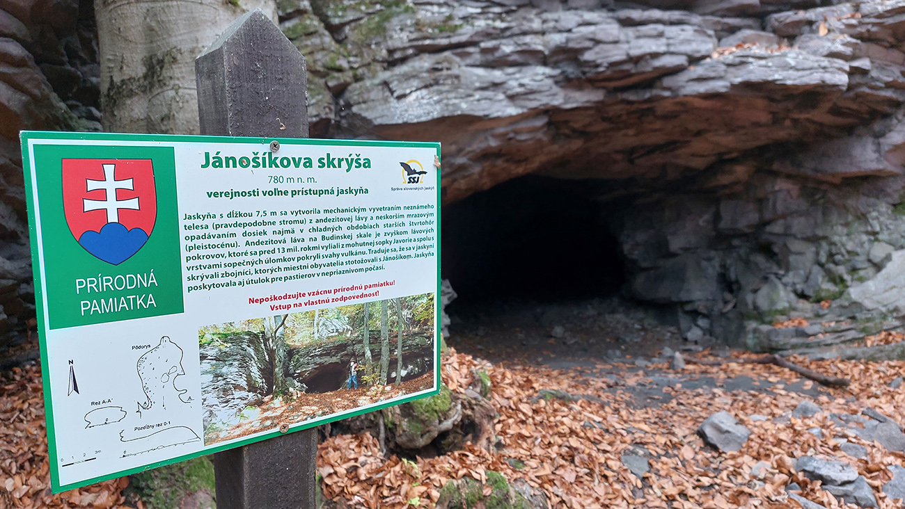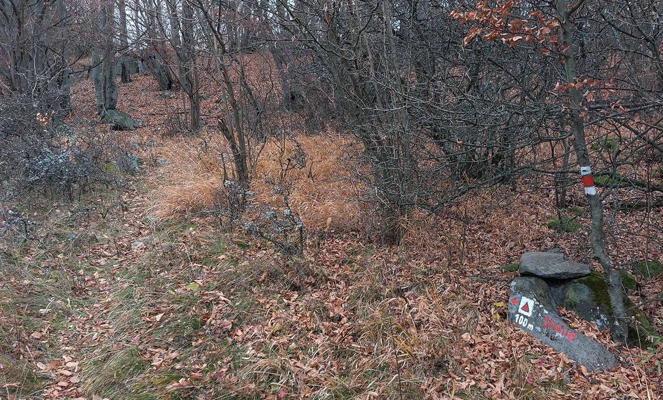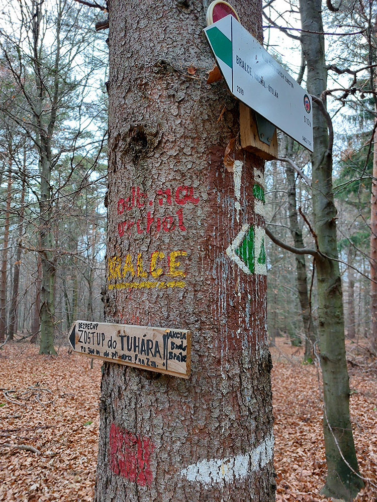 Ďalej je to na dlhší čas lesom, až kým ma to vypľuje na rozľahlé pasienky Budinských lazov. Ale cestou zaujímavá, krátka odbočka doprava po zelenej, kde pod nenápadným, placatým kopcom (so zavádzajúcim menom Bralo) stojí krásna skalná stena a dokonca s jaskyňou – čo je teda v našich andezitoch dosť unikát. Potom dávam aj ďalšiu kratučkú zachádzku na vrchol Bralce (817 m), kde stojí zaujímavá útulňa, a už len dupem lesom po príjemnej ceste na sever. Presne preto mám rád takúto klusaciu turistiku.