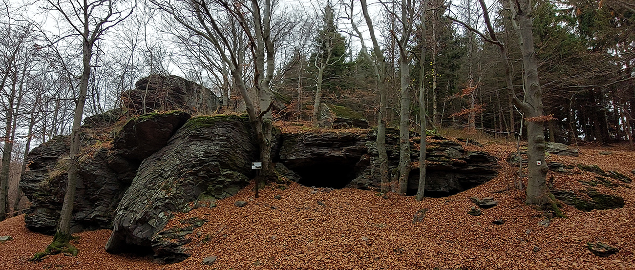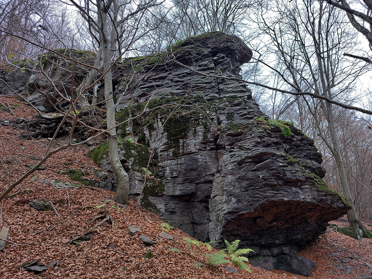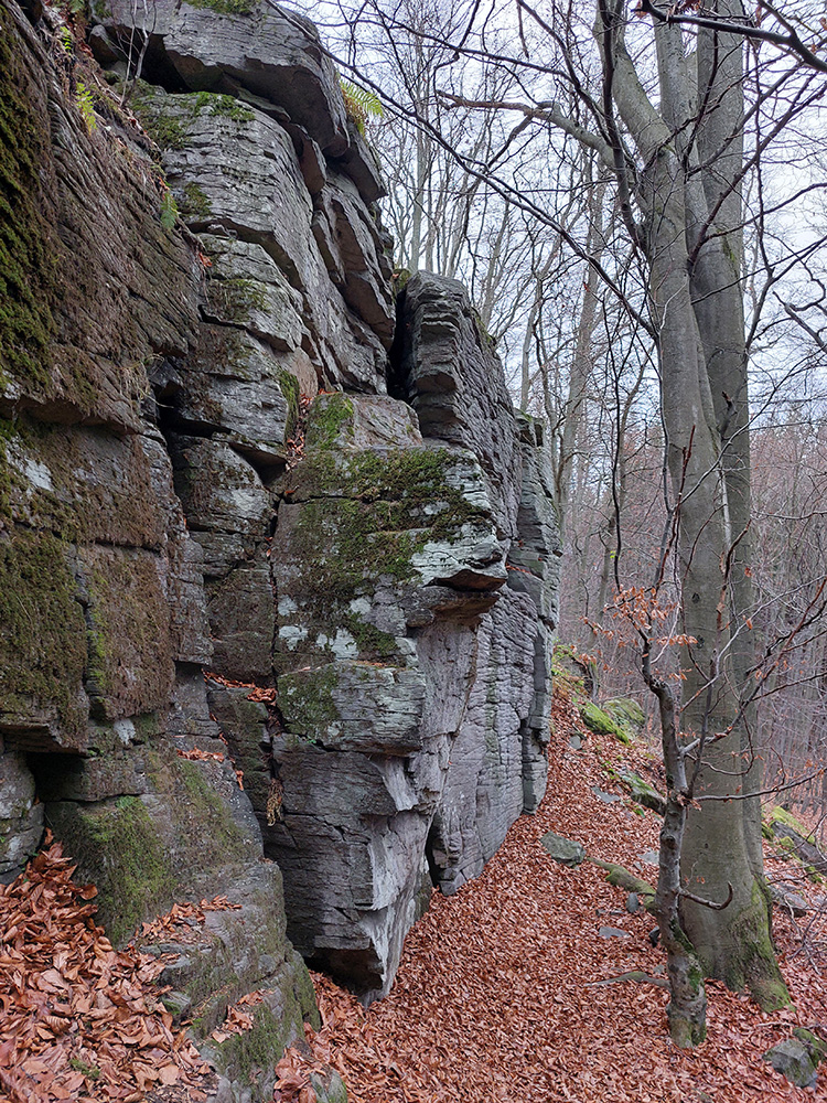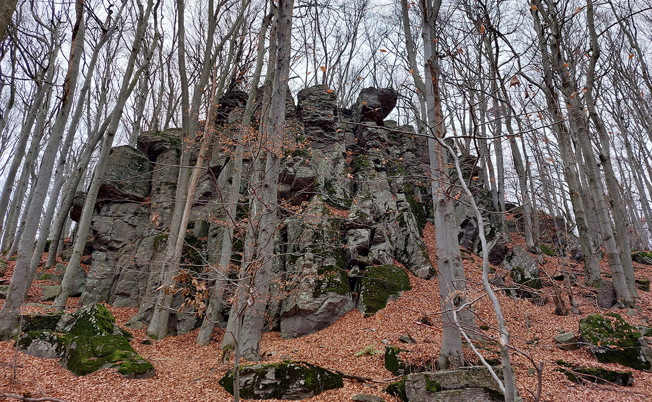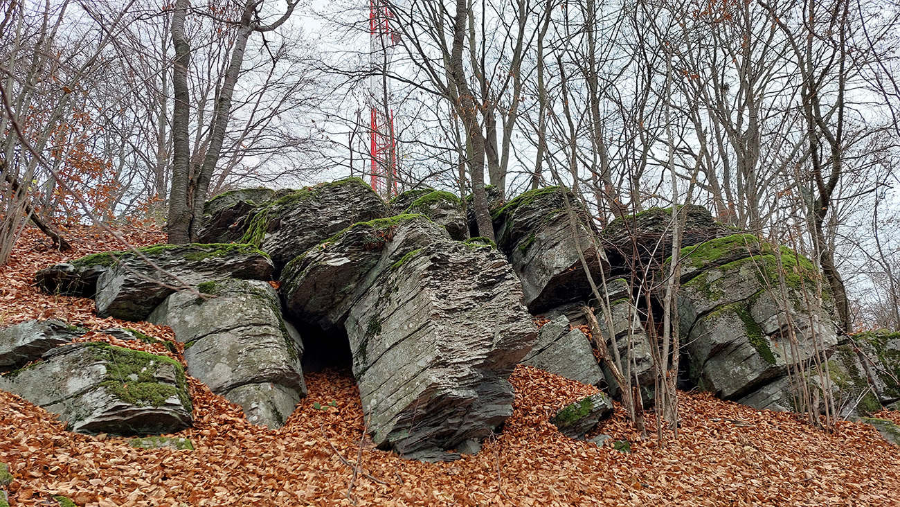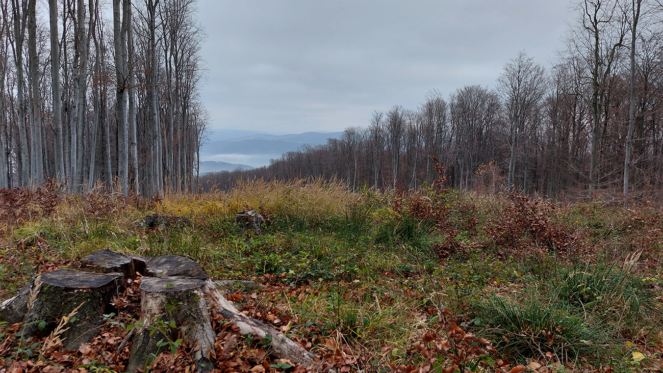 Ďalej je to na dlhší čas lesom, až kým ma to vypľuje na rozľahlé pasienky Budinských lazov. Ale cestou zaujímavá, krátka odbočka doprava po zelenej, kde pod nenápadným, placatým kopcom (so zavádzajúcim menom Bralo) stojí krásna skalná stena a dokonca s jaskyňou – čo je teda v našich andezitoch dosť unikát. Potom dávam aj ďalšiu kratučkú zachádzku na vrchol Bralce (817 m), kde stojí zaujímavá útulňa, a už len dupem lesom po príjemnej ceste na sever. Presne preto mám rád takúto klusaciu turistiku.