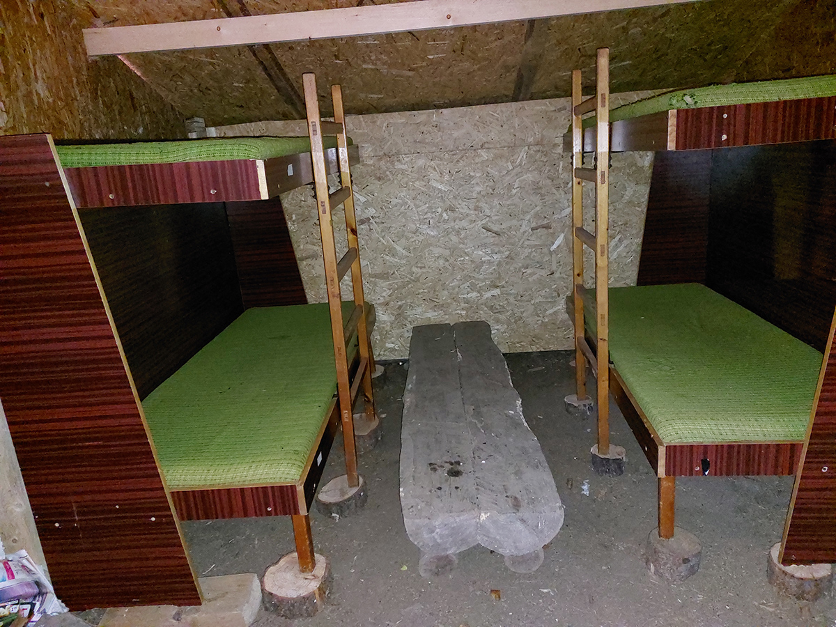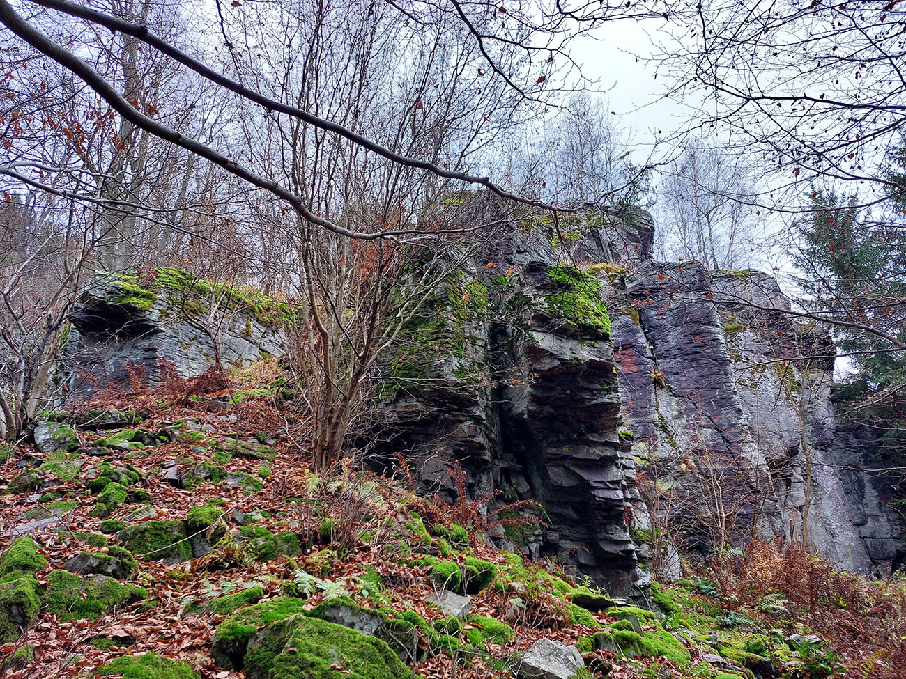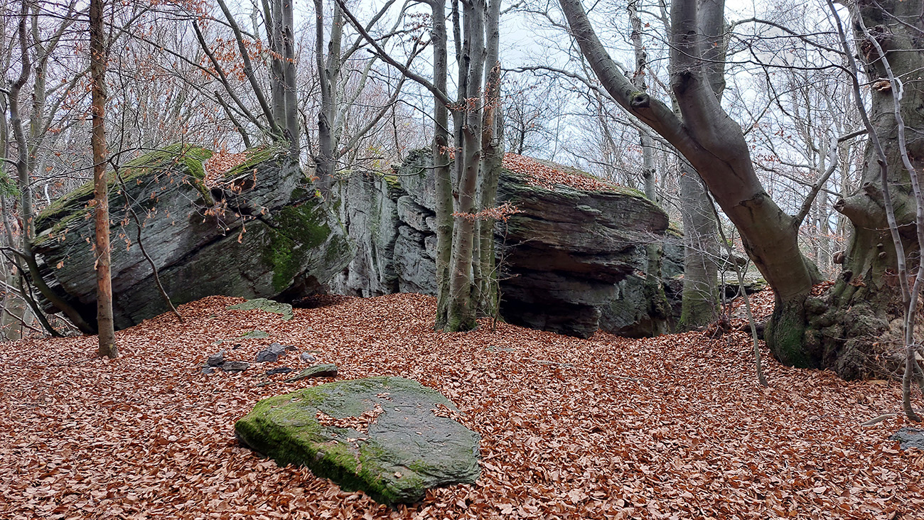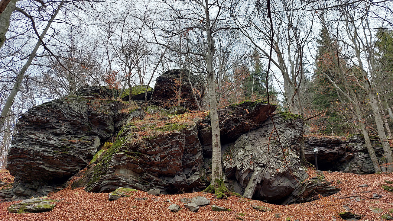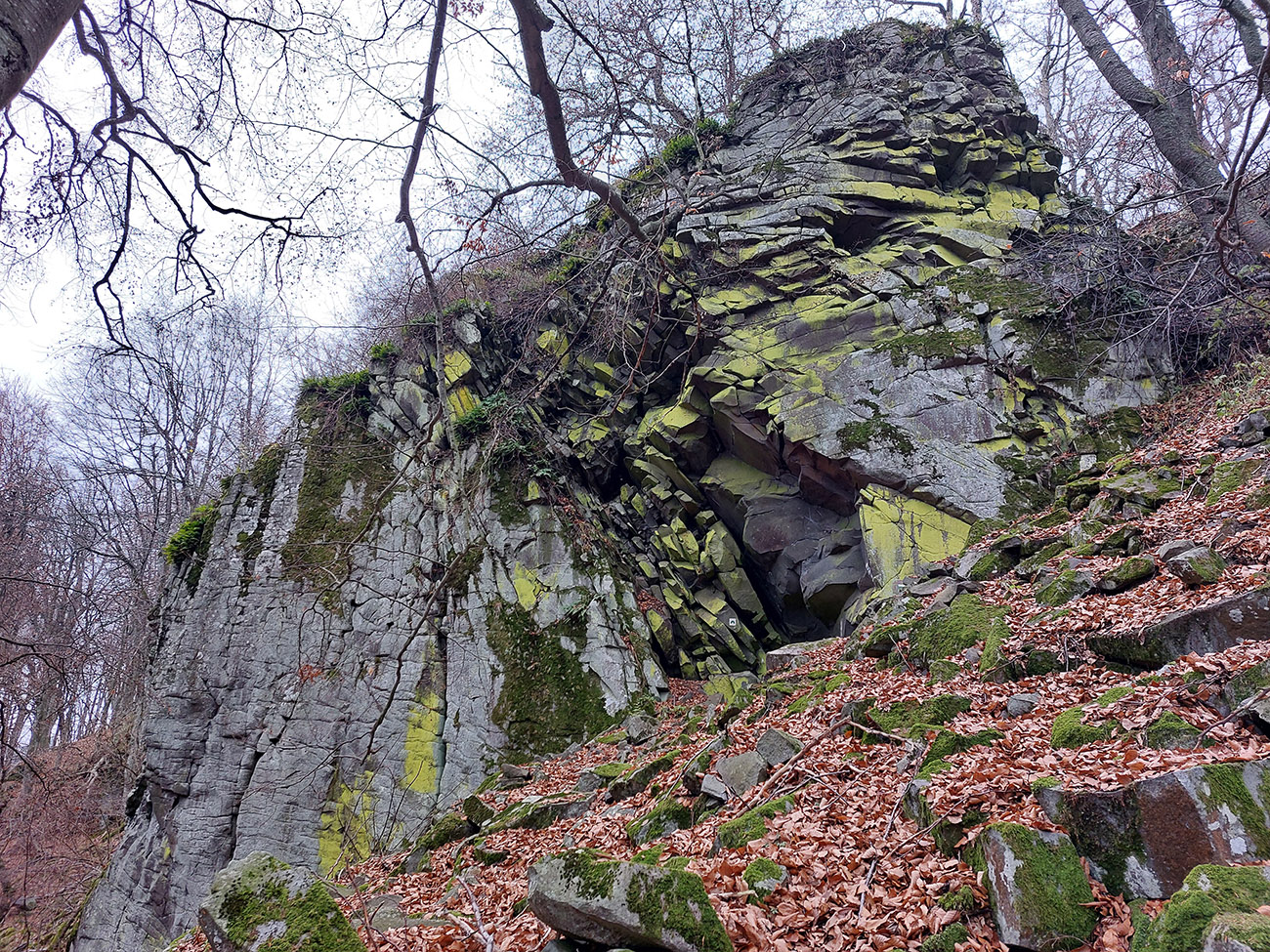 Ďalej je to na dlhší čas lesom, až kým ma to vypľuje na rozľahlé pasienky Budinských lazov. Ale cestou zaujímavá, krátka odbočka doprava po zelenej, kde pod nenápadným, placatým kopcom (so zavádzajúcim menom Bralo) stojí krásna skalná stena a dokonca s jaskyňou – čo je teda v našich andezitoch dosť unikát. Potom dávam aj ďalšiu kratučkú zachádzku na vrchol Bralce (817 m), kde stojí zaujímavá útulňa, a už len dupem lesom po príjemnej ceste na sever. Presne preto mám rád takúto klusaciu turistiku.