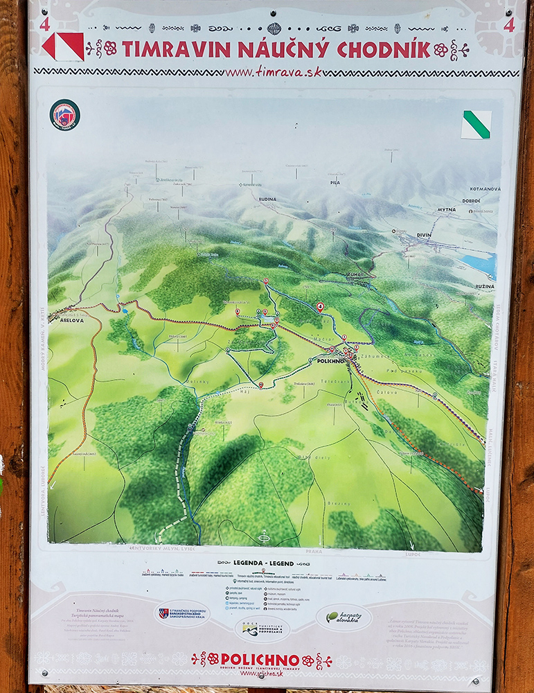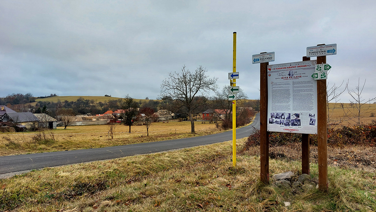 Tuhár je síce vysoko, ale Polichno ešte vyššie, na takej „náhornej planine“. Takže chodník strmší, častokrát aj užší, zo tri razy preskočí asfaltku, ktorá sa tam hore štverá serpentínami. Polichno preslávila najmä Božena Slančíková, čiže Timrava, takže pripomienok na ňu je v okolí hojne. Dedinka samotná vyzerá, že má dobré časy za sebou (ak dáke niekedy aj boli na tomto konci sveta), ale areál fary konečne ožíva vďaka rekonštrukcii a náučný Timravin chodník je zatiaľ funkčný, lebo relatívne nový. Dávam zachádzku aj ku Timravinej studničke a lavičke pod starou jabloňou – pekné miesta na prechádzky, na tých zarastajúcich pasienkoch to pred mesiacom muselo hýriť farbami. Cítim sa ako v Slovenskom krase, lebo vietor tu roznáša zvyšky takých tých korenistých vôní ako v stredomorí, aj záchyty prameňov sú tu všade naokolo. Pod zemou to musí byť tiež zaujímavé. Inak ani Praha nie je ďaleko :-)
