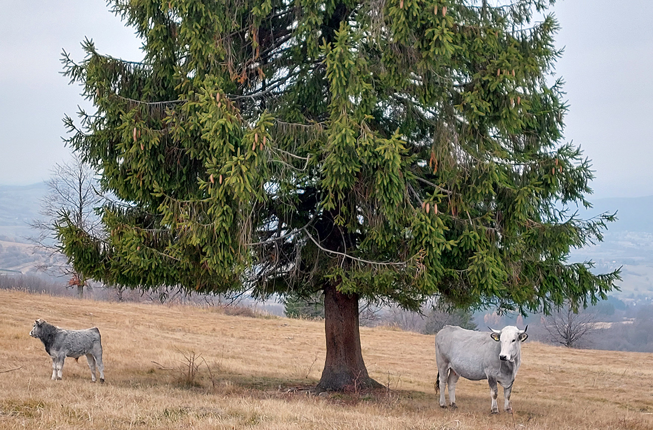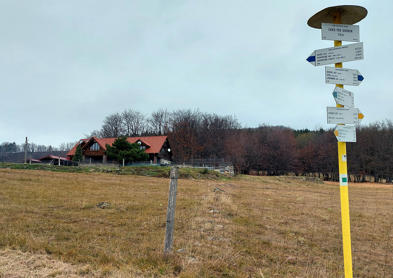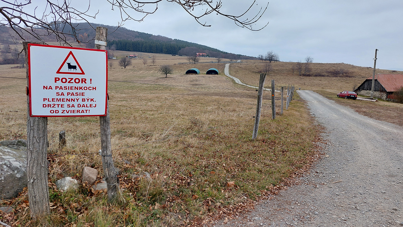 Hore na Javor musím aj cez bránku, ktorú majiteľ priviazal krížom cez cestu, ale to až tak nevadí. Len dúfam, že ju pri preliezaní nezlomím, krehká je dáka... Chodník tu zase stúpa strmšie lesom popri ohradníkoch, a keď sa vynorím na plešinke pri turistickom prístrešku a vysielači, posiela ma cez tú elektriku rovno na pasienky, strmo dole kopcom. To by bolo síce fajn, lebo sa otvárajú výhľady do strakatého Podpoľania... Ale už skôr boli na plotoch rozvešané upozornenia, aby sa turisti držali ďalej od zvierat, lebo sa medzi nimi pasie aj plemenný býk. Lenže značka viedla doteraz vždy len poza ploty! Hehehe, možno aj sranda bude dole kopcom...