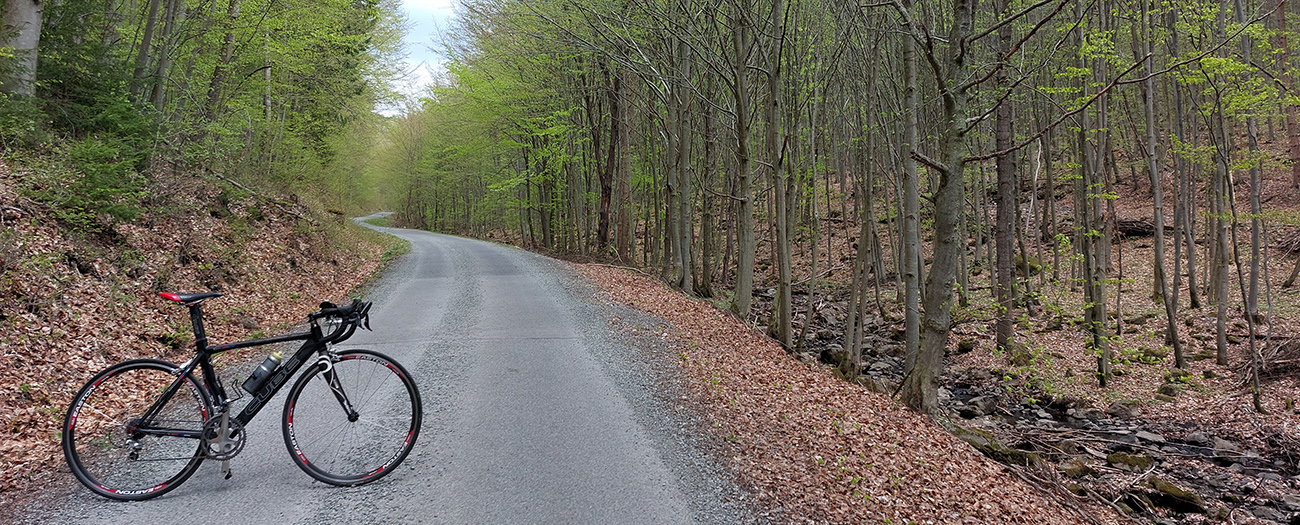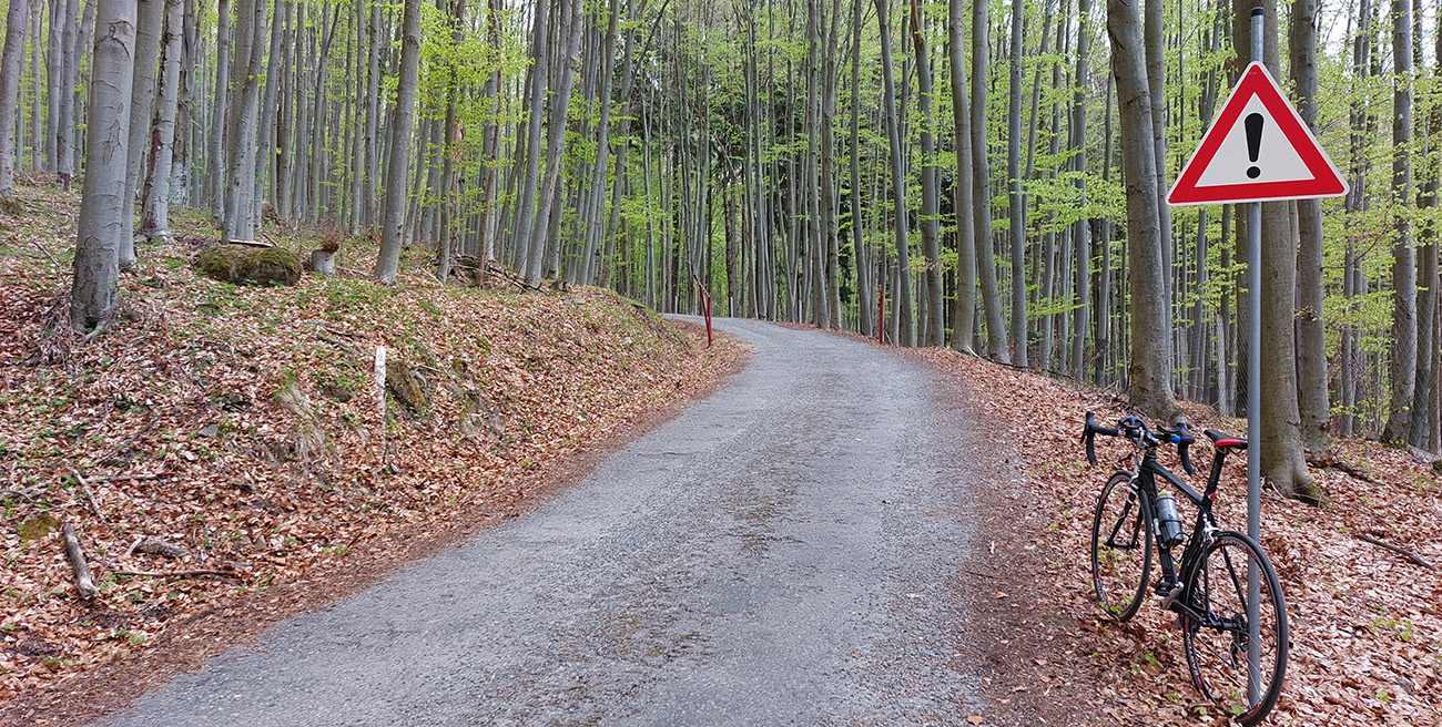 Spomedzi voňavých trnkových mantinelov som teda prešiel do slnkom ešte presvetleného, sviežo zeleného, rozštebotaného bukového lesa. Popri ceste si tam pomedzi veľké balvany žblnká potok, no romantika ako bič! Asfalt s výškou akoby stále lepší, zato posypu na ceste po zime ostalo hojne. No ani ten moc nevadil, autami bol pekne vyhádzaný do stredu a na boky. Len už som dlhšie išiel na „gašparkovi“ a ďalej nebolo kam dávať. A stále častejšie zo sedla, aj keď sklony tu nie sú ktovieaké.