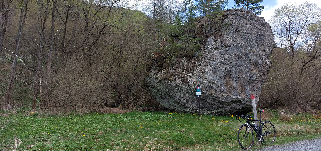 Bátovský balvan je miestna rarita, nebolo možné nezastaviť sa a nepoobzerať ho, ale až k nemu som nešiel - aj tak to v tráve pod nohami furt čvachtá, a takto na jar zvlášť. Ale tu nižšie v doline už les zase intenzívnejšie voňal, pinky pinkali, Hučava hučala a posyp už z cesty dávno zmizol - no radosť jazdiť, a zadarmo samozrejme, lebo furt z kopca. Aj keď vietor nejako zmenil smer, lebo fúkal čoraz silnejší oproti.