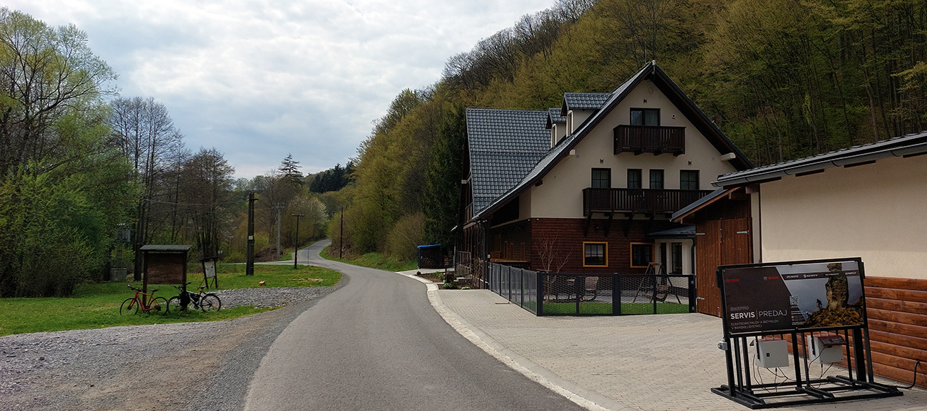 Potom už netrvalo dlho a brzdil som pri Hrochotskom mlyne – dáky pustý sa mi zdal, ale zato dve nové nabíjačky pre električkárov tam stáli. Takže už len maličká dilema, či doľava na Očovú, či doprava na Hrochoť. Samozrejme vyhrala Hrochoť – lepší je krátky, strmý výšľap do dediny, ako sa potom zo Zolnej plaziť dlho hore dolinou. Aj lepší asfalt je tu. Obchádzku si dám potom inde.