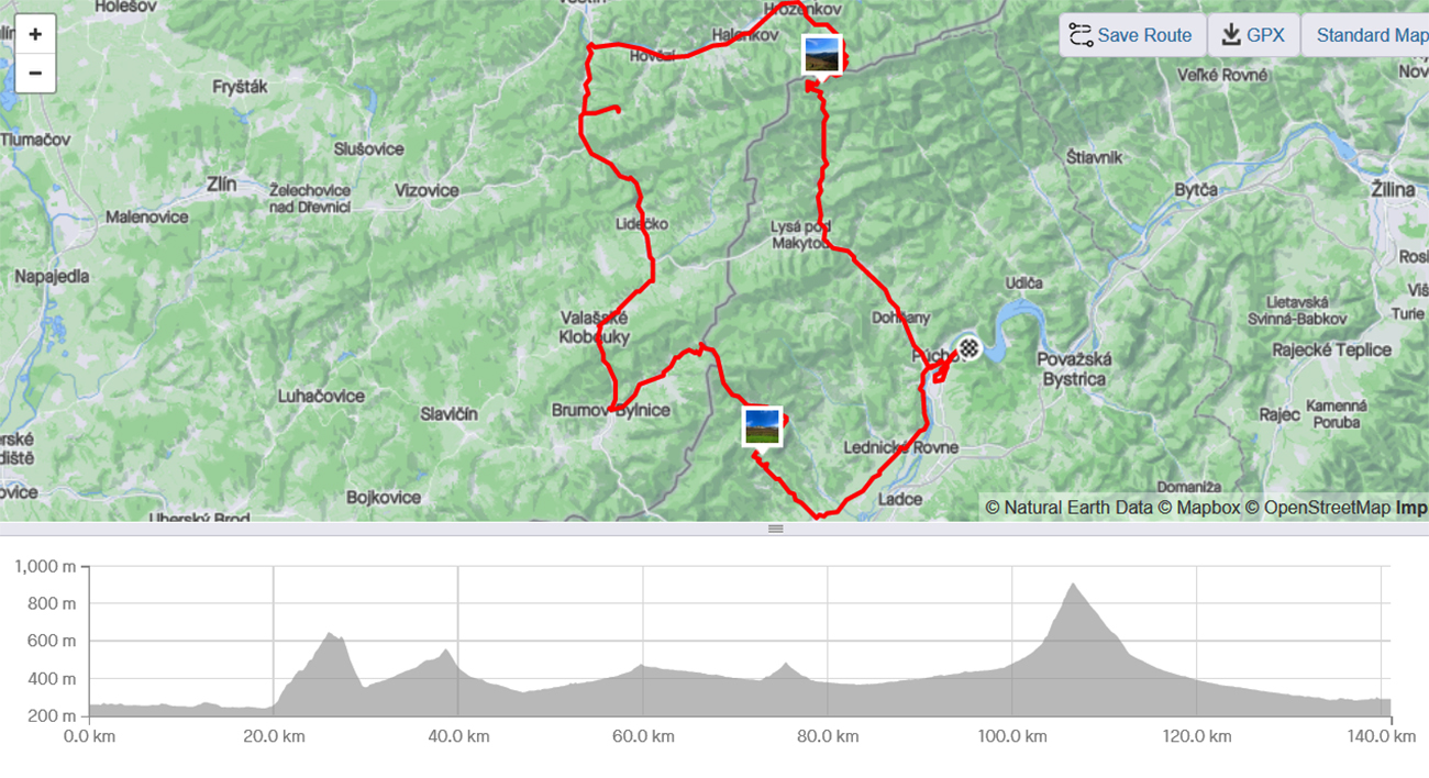 Nechce sa mi nejako na bajku do terénu zatiaľ, ktovie prečo... Asi že je čistý a furt prší :-) Takže keď po daždi na prvého mája oschli cesty, vyšiel Oskar a vyskytla sa možnosť spolujazdy (rozumej visenia v háku), nahodil som cesťák do vlaku a vybral som sa objavovať s miestnym znalcom cesty na pomedzí Považia a Valašska. Taký príjemný okruh to mal byť: z Púchova cez Vršatské Podhradie, Červený Kameň, Brumov – Bylnici, Vsetín a Kohútku nazad do Púchova. Asi 130 kilákov. S tým, že skúsime nejaké skratky, aby sme sa vyhli hlavnej ceste pred Vsetínom, aj keď takto na sviatok sme nejakú príliš intenzívnu premávku nečakali. Skratka nakoniec nevyšla, ale viac ako áut bolo asi motorkárov, tak celkom pohoda. Aj teplota taká príjemne jarná sa vydarila, ani vietor moc neotravoval, aj keď sa sviniar točil akurát tak, že furt sme ho mali z protismeru. Alebo sme boli takí rýchli? Len doma som bol potom prekvapený, aké mám pripálené lýtka z toho slnka. Takto nejako ten švih vyzeral na mape: