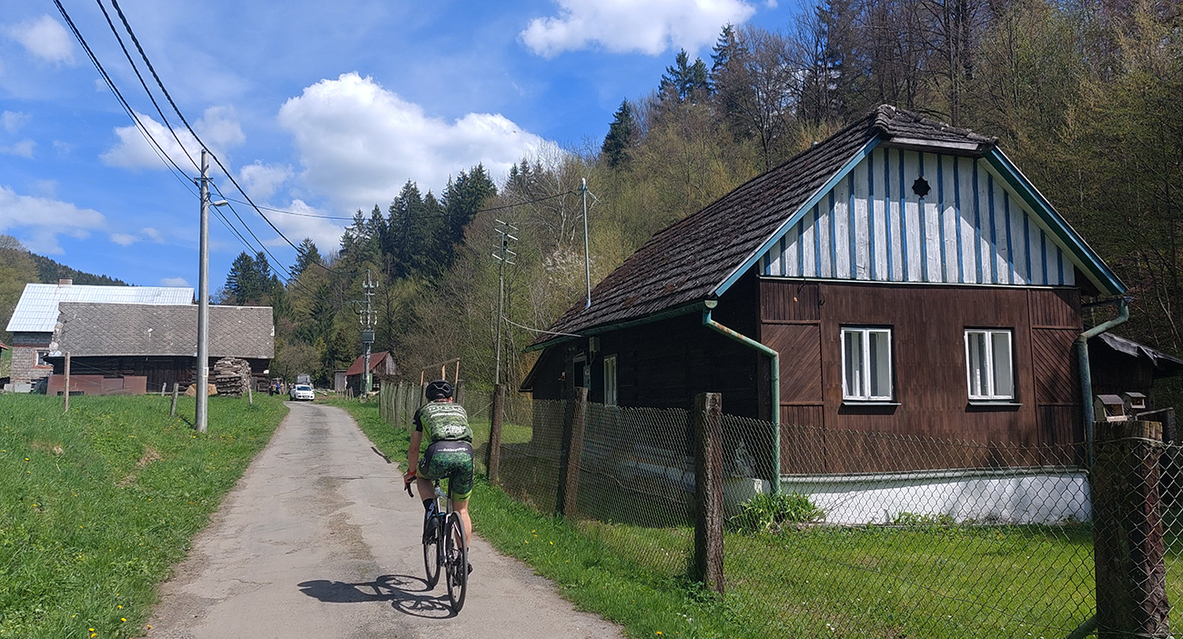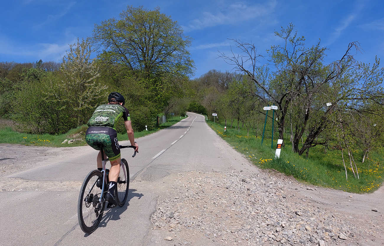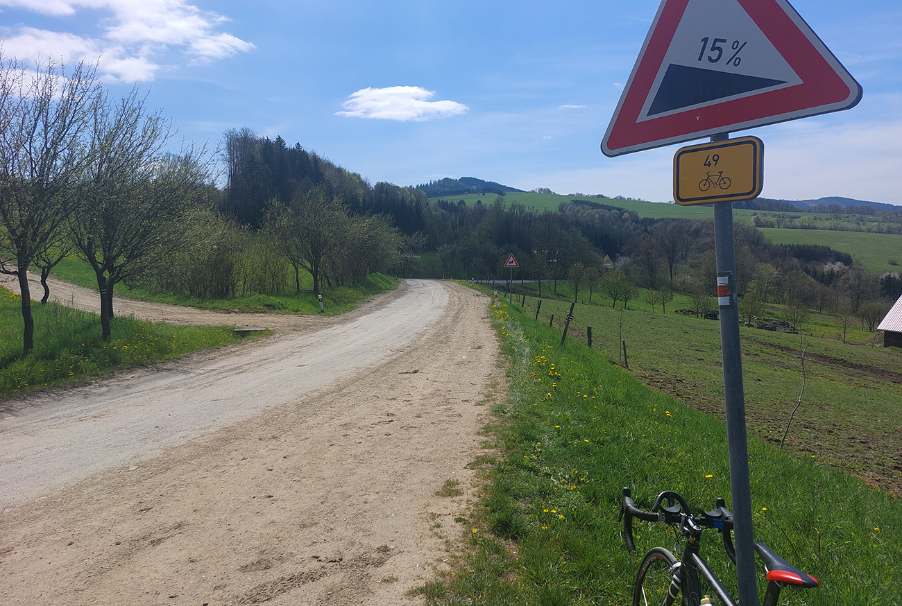 Stúpanie dolinou na moravskú stranu je na začiatku pohodové, okorenené výhľadmi na skaly vpravo – vľavo. Čo ma ale prekvapilo, to bola takmer gravelová vložka cez kopec – drsný, starý, vymrvený asfalt hneď za hranicou. Smerom hore do sedla aj dole do Nedašovy Lhoty. Majú to tam bratia a sestry nejaké zanedbané – na to, ako vo veľkom všade asfaltujú nanovo. Ale do kopca nevadilo, dolu tými 15 percentami sme si pribrzdili: