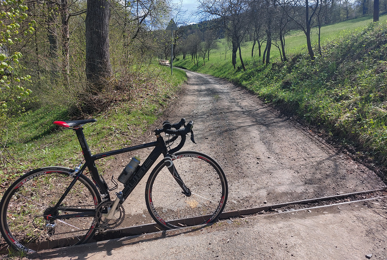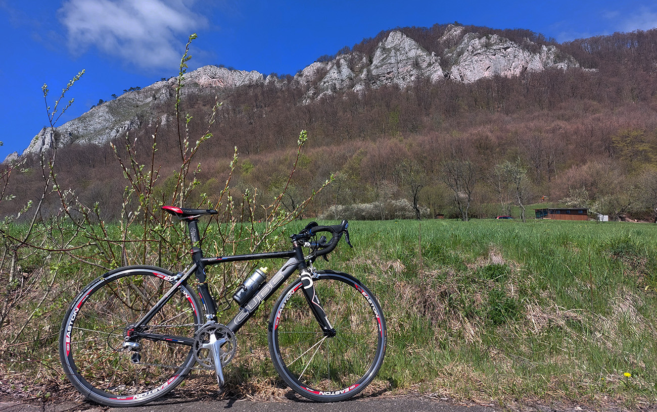 Až hore sme nešli, nešlo nám o horskú prémiu, ktorá je tam nakreslená. Pekne doprava cez dedinu a davaj dole do Červeného Kameňa. Zase poriadne prudko – tak tadeto hore jedine na poriadne ľahkých prevodoch by som šiel. Pekná cesta, dobrý podklad, ale brutus sklon. Predtým som si neodpustil fotopauzu – zátišie s bradlami: