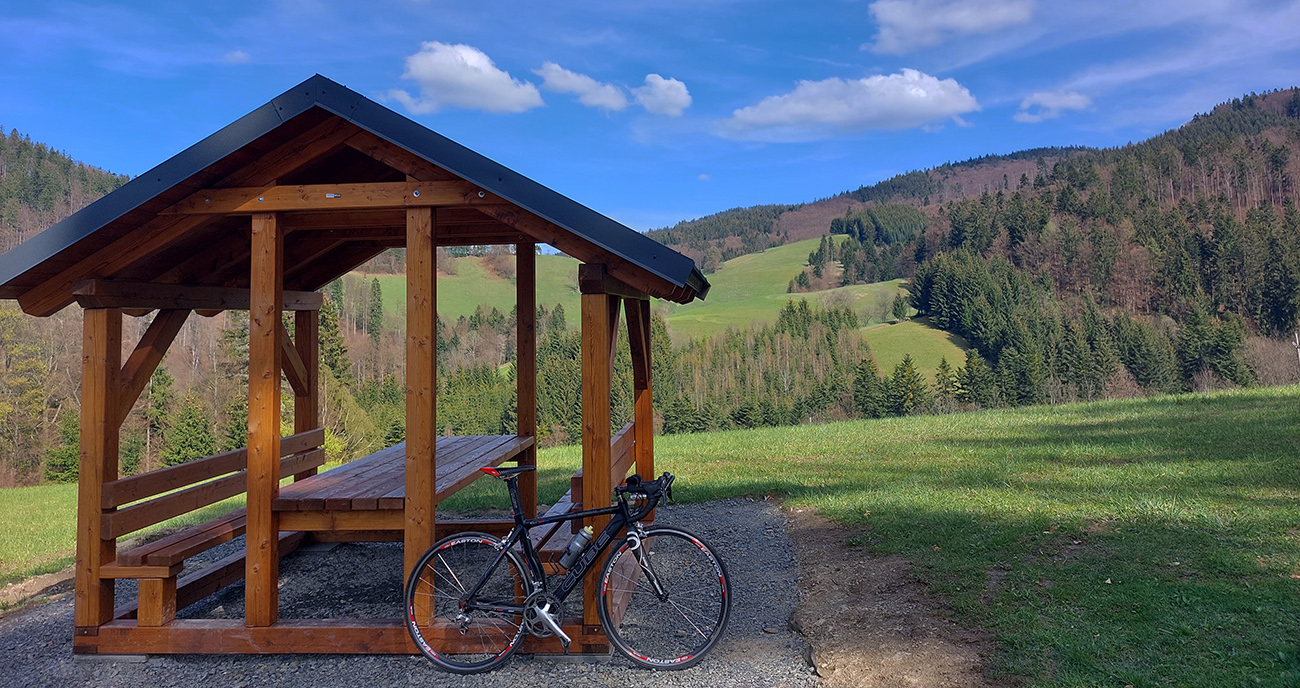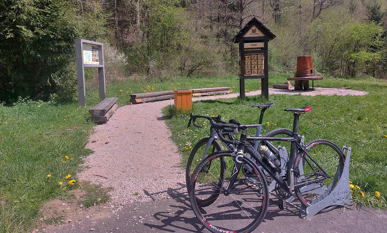 Prudko dole to bolo len krátko na začiatku, nasledoval rýchly zošup po hladkom, cez prvé vypipľané valašské dedinky, zrastené pozdĺž cesty do jednej. Z Brumova do Valašských Klobouk už bola na ceste väčšia premávka, ale sme chytro zistili, že paralelne vedie asfaltový cyklochodník Bevlava. Nechrtili sme, tak hybaj po ňom. Super je, aj sme jedno odpočívadielko využili na prehryznutie dákych sladkostí zo zásob.