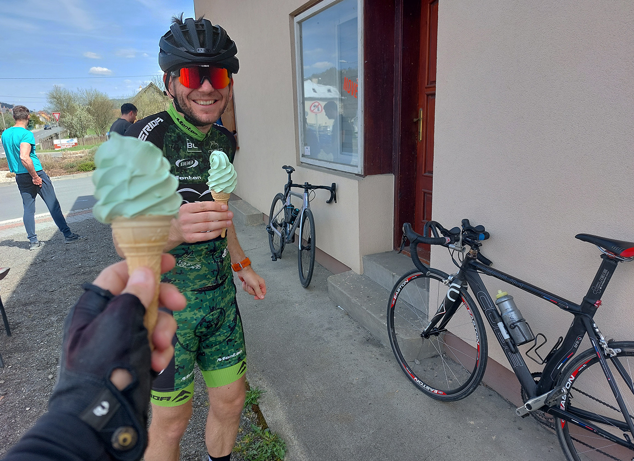 Tak sme znovu využili Bevlavu, až do Ústí u Vsetína. Premávka ako na hlavnej, našťastie len cykloturisti - najčastejšie na ebajkoch s gumami ako z traktora, to na tieto hladučké asfaltky treba, hehe... Keď sa cyklotasa začala stáčať podozrivo ku miestnym krčmám, tak aby nás nevcuclo, odbočili sme doprava, smer Slovensko, a začali jemnučko a pohodlne stúpať popri Vsetínskej Bečve. Premávka už síce hustejšia, veď ako o víkendoch na trase do horských rekreačných obcí, ale vietor aj slnko do chrbta a cesta široká, krajnica použiteľná a okolie na pohľad pekné. Janová, Hovězí, Huslenky, stop! Lebo oči zbadali zmrzlináreň a už sa točila – pravá pistáciová: