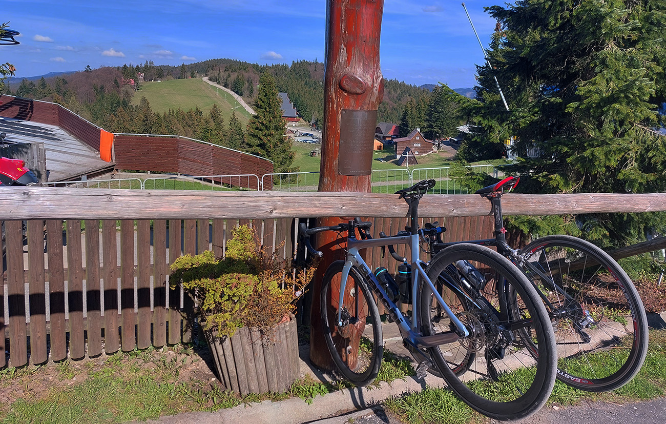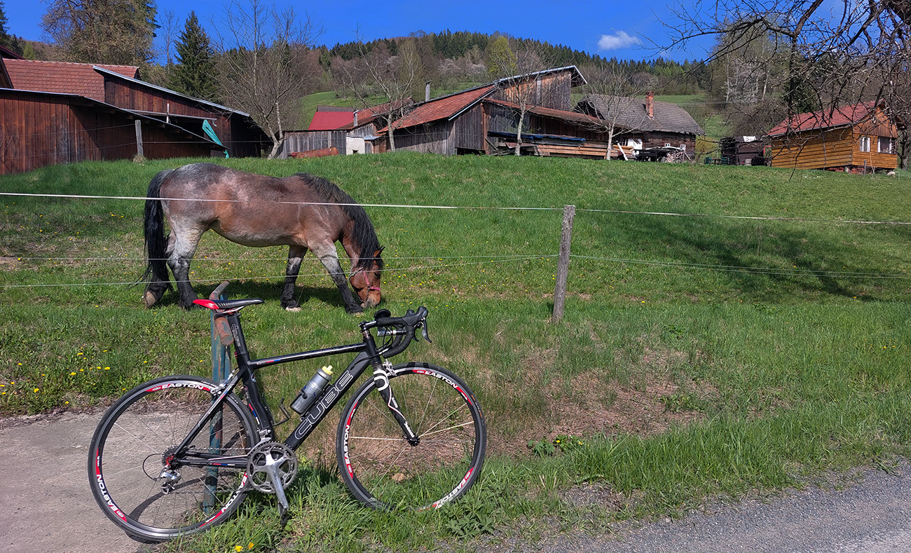Boli treba nejaké kalórie navyše, lebo do Nového Hrozenkova už to nebolo ďaleko a tam... Tam sme sa v podstate z druhej strany napojili na našu jesennú Javornícku cyklostovku a išli sme si zopakovať trhanie reťazí na Kohútku. Aspoň už som vedel, čo ma čaká a Petrovi som vopred sľúbil, že nebudem pindať. A šlo sa. V doline namiesto oviec tentokrát pózoval kôň, tak som si povedal, že bude dobrá titulka, ale nakoniec nebola: