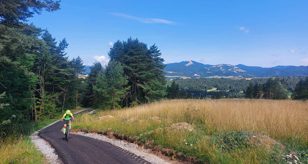 Z BB - city teda začiatok klasicky popri Hrone do Šalkovej, a tam na jej západnom konci hneď doprava, na nový asfalt medzi prvé domy. Zatiaľ bez značenia, ale hneď poriadne výživne hore brehom. Asfalt už položený, aj ovcami impregnovaný, chlapi akurát makali na dorábkach – kládli odvodňovacie rigoly po bokoch a obsýpali krajnice. Najskôr strmší les, potom miernejšie lúky – cesta tu inak vždy bola, len či musí byť teraz asfaltová? Každopádne iba úzka, špeciálne pre cyklotrasu.