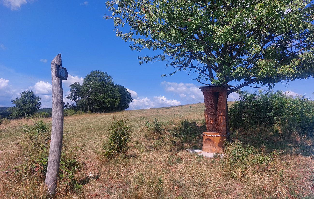 Od križovatky Čičeredno (fotka tu hore) pevnejšie translúčne cesty so starým asfaltom aj šotolinou, krásna drevenica v sade pri ceste, stále ďaleké rozhľady a pred nami zjazdík do krasovej dolinky Pôlč. Aj so závrtmi na jej plochom dne. A ako sme sa natočili viac na sever, aj panorámy Nízkych Tatier a Starohorských vrchov nám vbehli do zorného poľa: