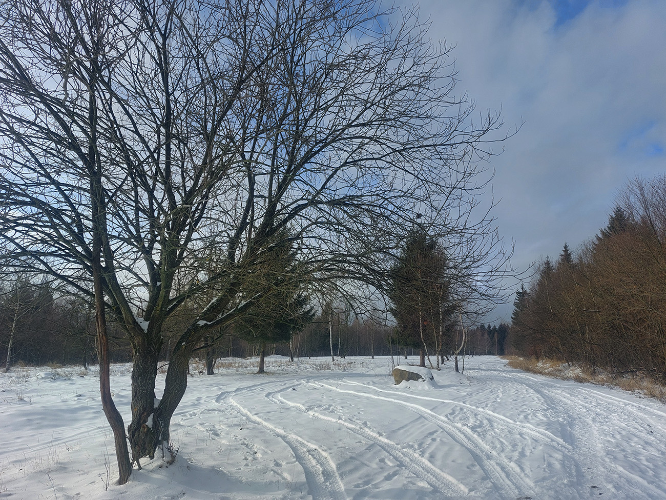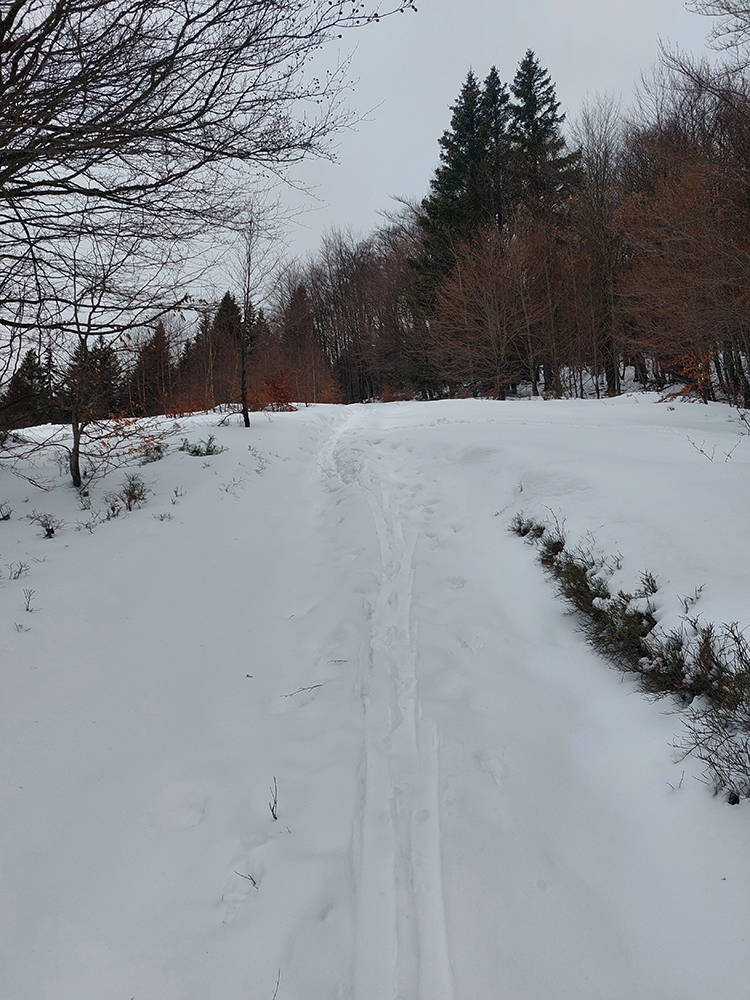 Lenže ako sme stúpali, nieže by bolo menej snehu, ale akosi pribúdalo kameňov. Na lúke nad dedinou ešte pohoda, krtince skryté, ale na ceste z Trusalovej nejaký moc bodkovaný podklad a ešte horšie to bolo medzi Zajacovou a zákrutou. Ale sme sa zaťali, že neprenášame, veď kameňačky znesú a do kopca to predsa nevadí. Nad zákrutou (po drevosklad) ešte väčšie zúfalstvo, ale to lístie vo svahu vedľa cesty bolo našťastie dosť jemné voči pásom.
