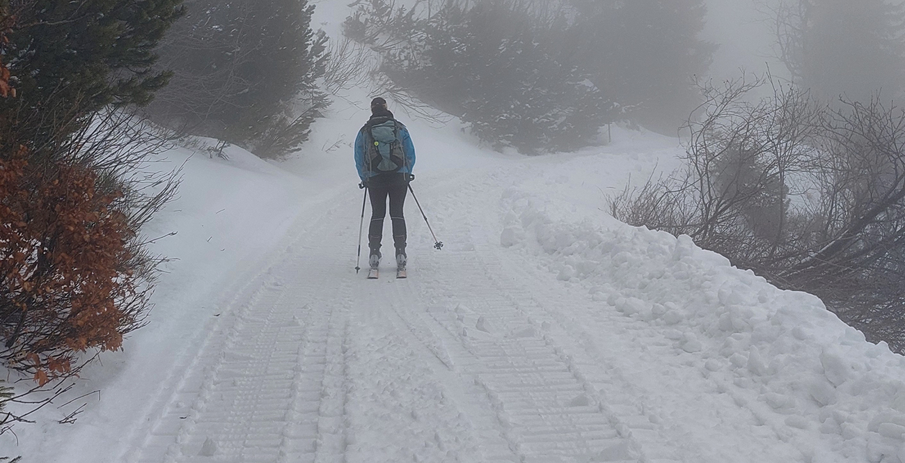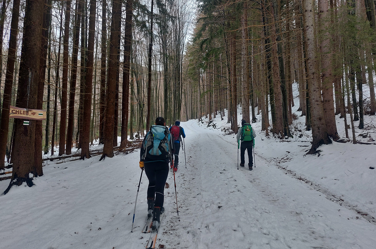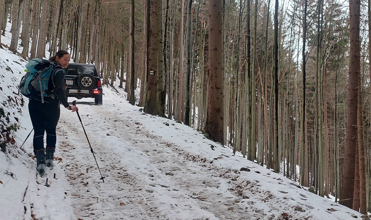 Jeden exemplár pred nami išiel z drevoskladu doľava, strmo po skialpovom chodníku, a potom hore hovoril, že na tom lístí to ani moc nepodklzovalo. My lenivší sme sa vybrali rovno po ceste, kde koľaje od áut, zásobujúcich chatu, vyzerali použiteľne. Väčšinou aj boli, no...