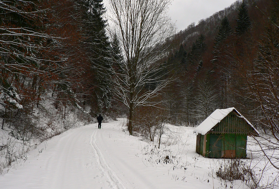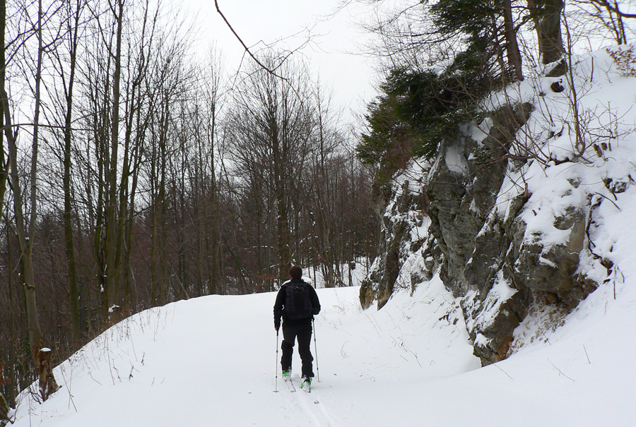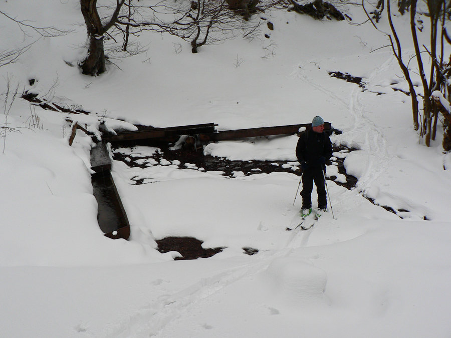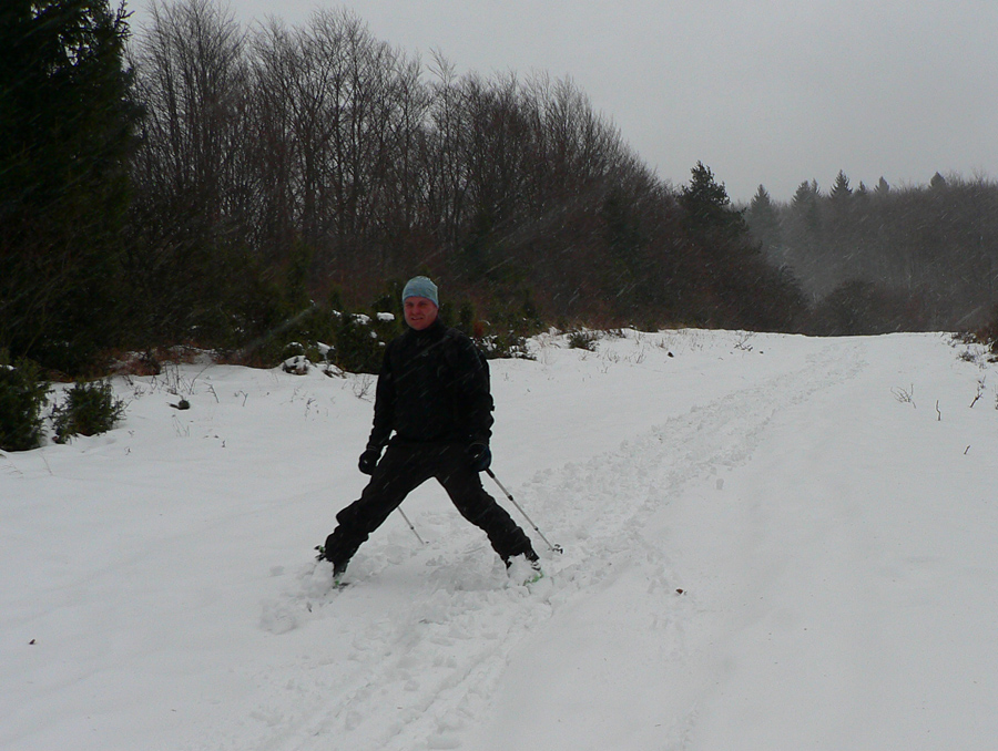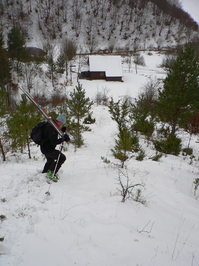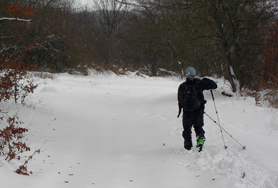 Z Magury dole sme začali zliezať pomaly a opatrne na pásoch, v ústrety blížiacej sa fujavici, ktorá s poklesom výšky prechádzala do lejavice. V hornej časti lesa sa ešte dalo kĺzať, ale spodný úsek po strmej zvážnici už sme šli pešo - pod hrubo sa tváriacou bielou vrstvou číhali kamene, to už ani na kameňáky nebolo. Asi si budeme musieť na takéto podmienky zvykať...