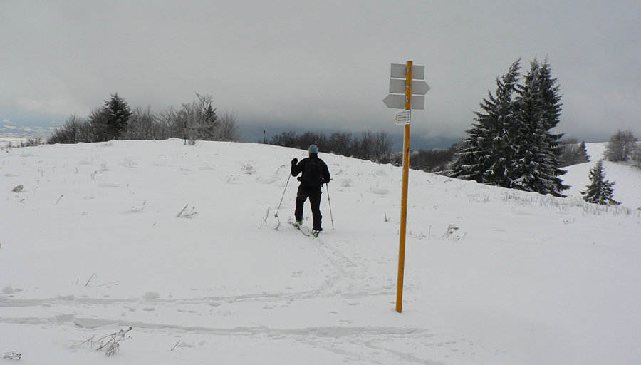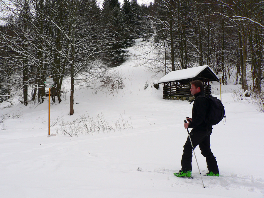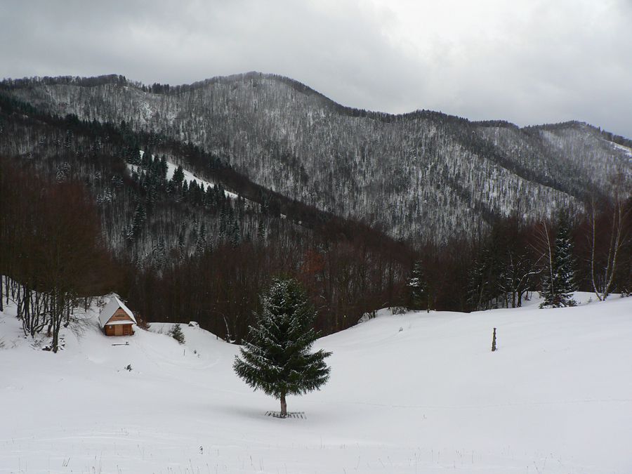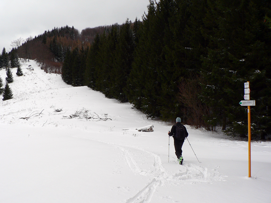 Jednoduchý okruh je tak na štyri hodinky, v lete sa dá aj na bajku. Začiatok aj koniec má pri chate na hornom konci Nolčova v ústí Veľkej doliny, kde sa dá aj pohodlne zaparkovať. Vyťapkali sme po lesnej ceste do sedla Príslop (zelená značka). Tam sme okukli nový (a otvorený) zrub, jediným strmším lesom sme sa dostali na nolčovské hole (červená hrebeňovka) a cez Maguru sme po žltej okruh uzavreli. Dole to lepilo, hore bolo suchšie, prerážali sme stopu tak 20cm hlboko, podklad žiadny. Myslel som, že hore bude snehu viac ako dole, ale bolo to skoro rovnaké, žiadny zázrak, krutá realita.