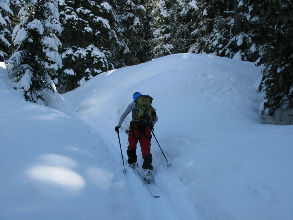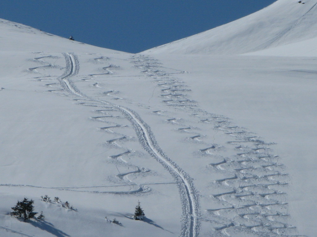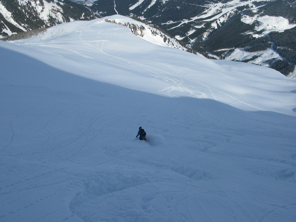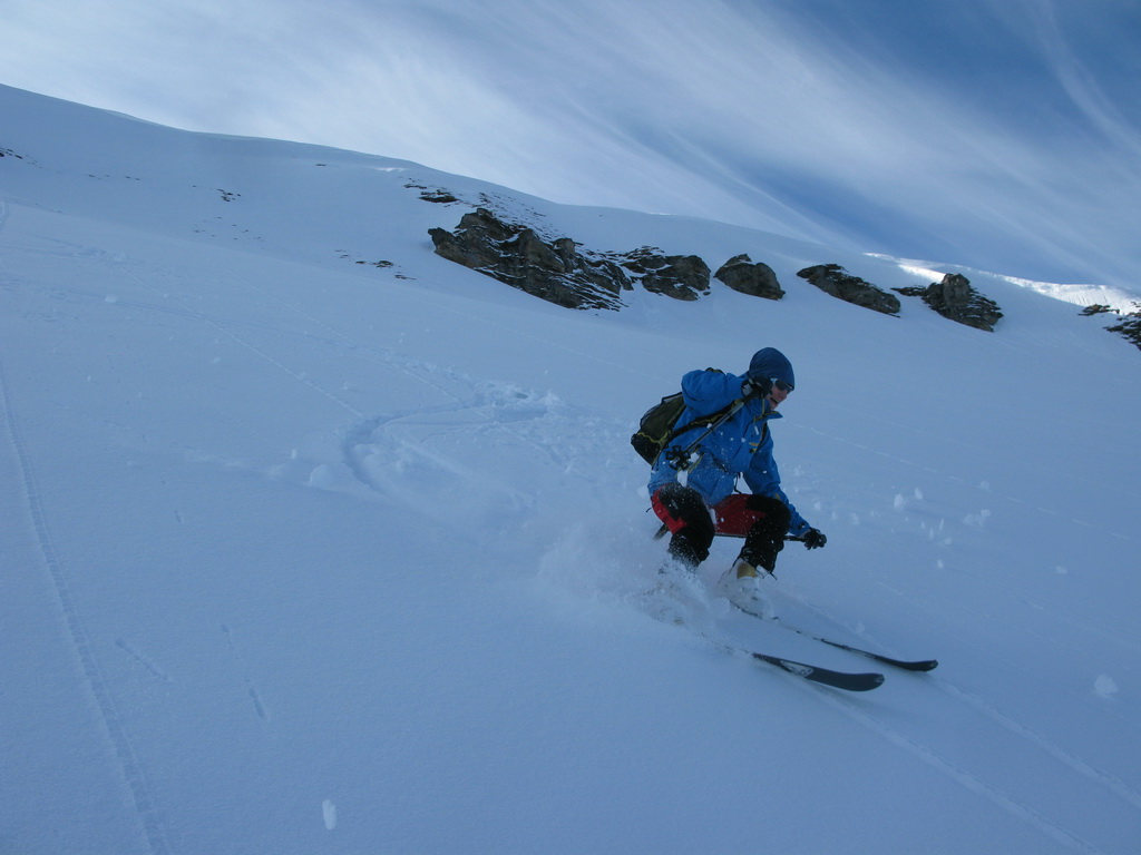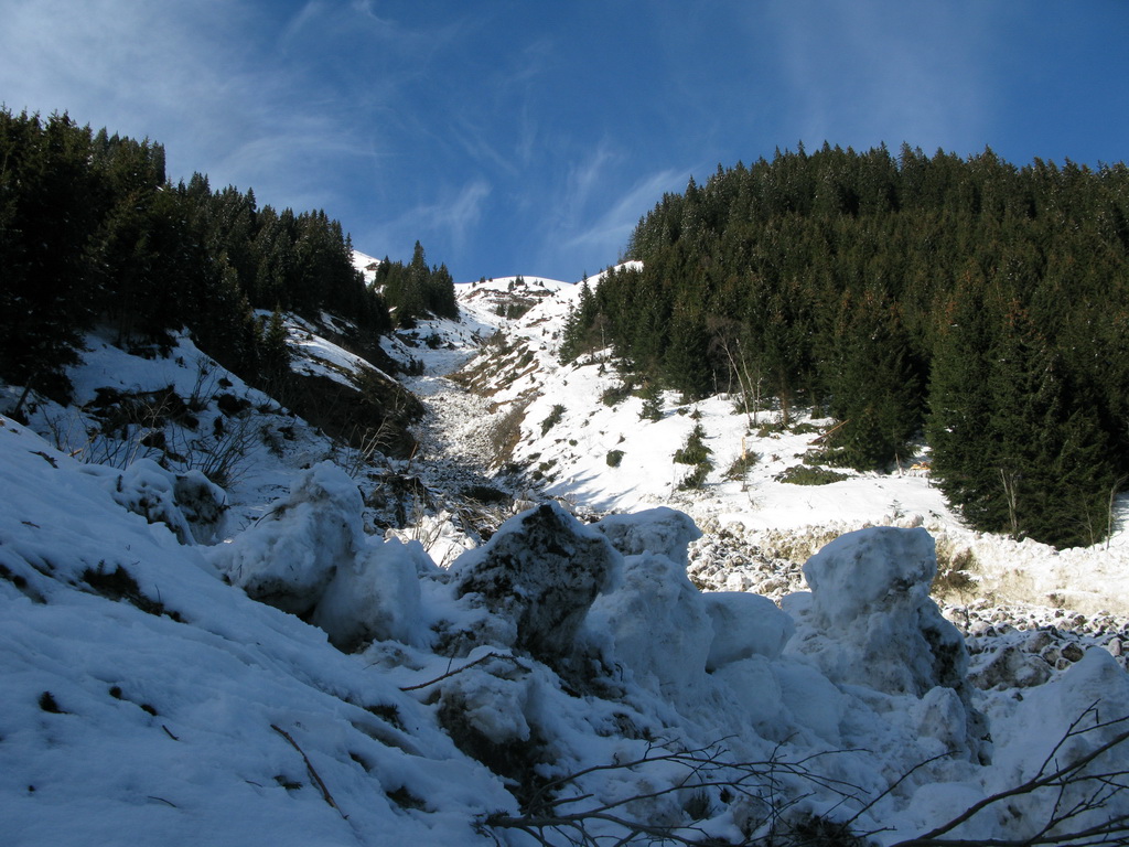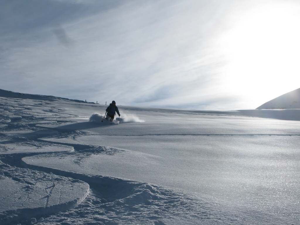 Do zjazdu sa púšťame až okolo pol štvrtej. Hore kúsok kôrka, ale potom už nekonečný prašan...