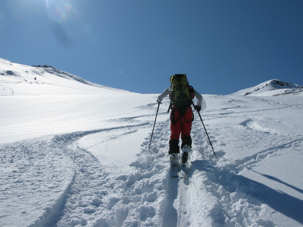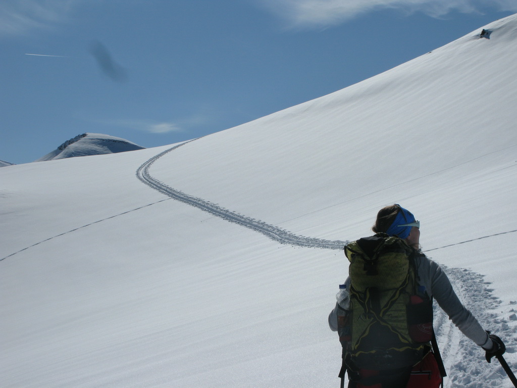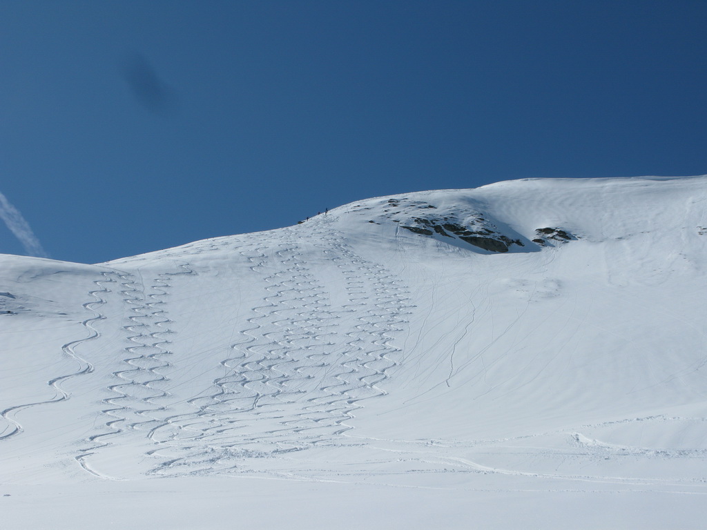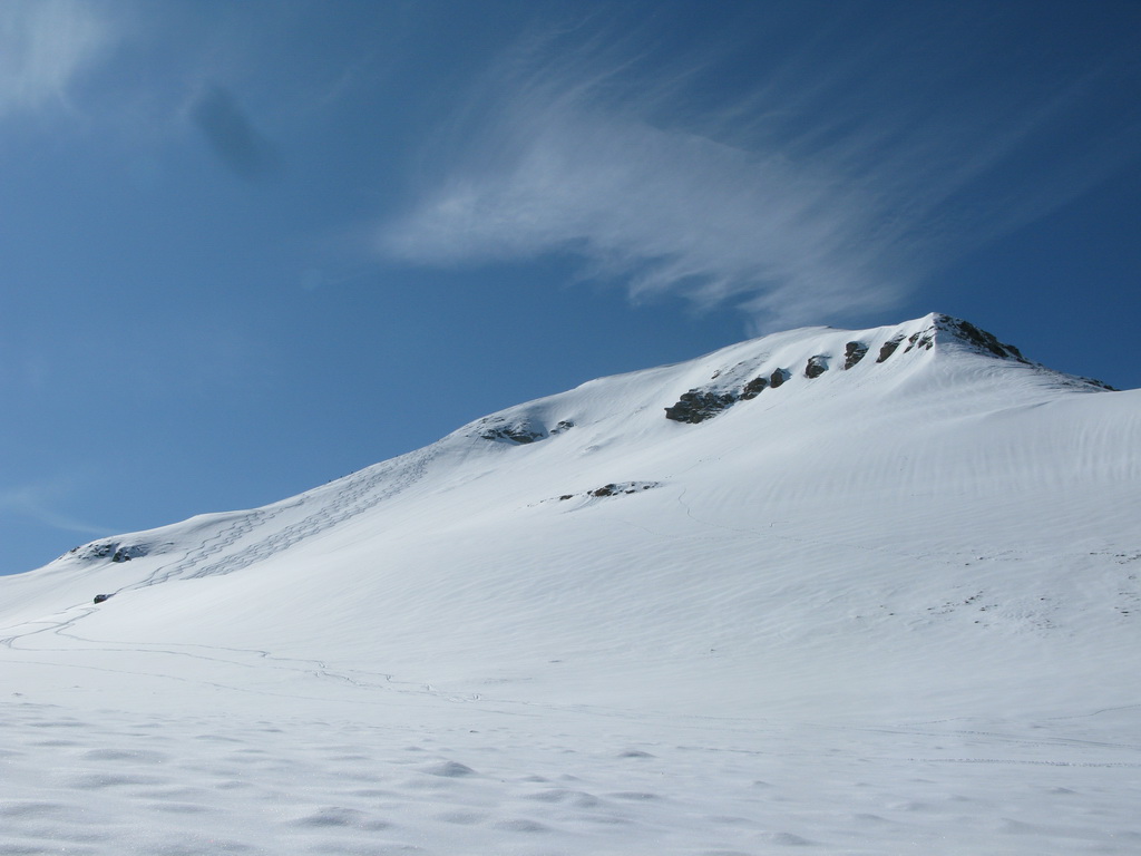 Väčšina dnešných návštevníkov je už dole. My sa nikam neponáhľame. Na vrchole konečne dobiehame aj skialpinistu samotára, ktorý šiel celý výšľap kúsok pred nami. Na naše veľké prekvapenie zisťujeme, že je to asi 70-ročná babka... Nuž iný kraj, iný mrav - toto zatiaľ doma ešte nezažijeme...