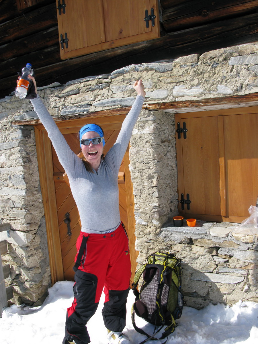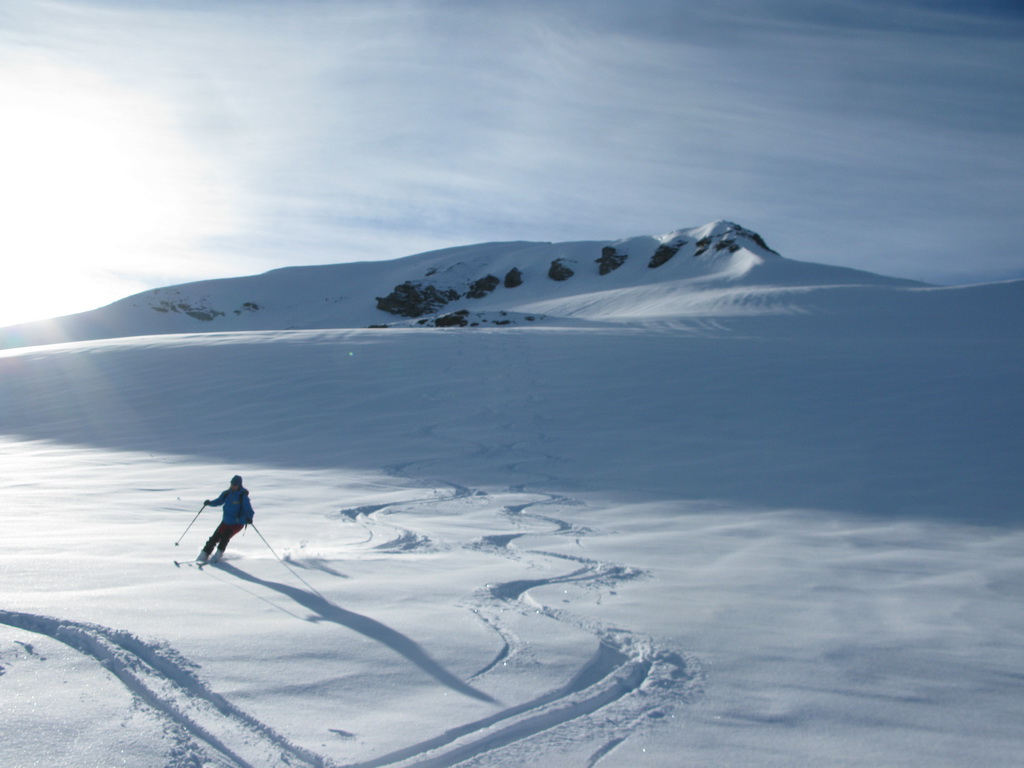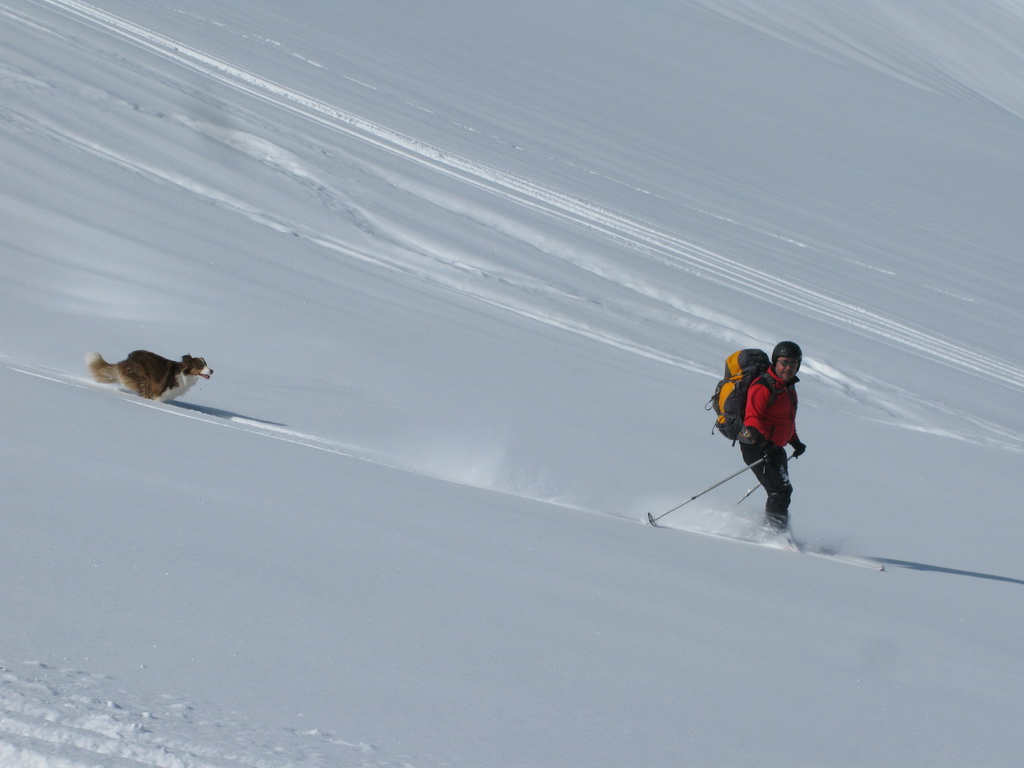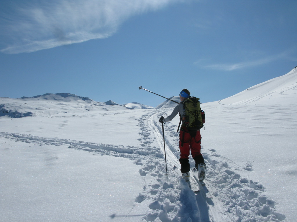 Väčšina dnešných návštevníkov je už dole. My sa nikam neponáhľame. Na vrchole konečne dobiehame aj skialpinistu samotára, ktorý šiel celý výšľap kúsok pred nami. Na naše veľké prekvapenie zisťujeme, že je to asi 70-ročná babka... Nuž iný kraj, iný mrav - toto zatiaľ doma ešte nezažijeme...