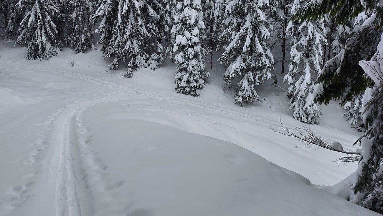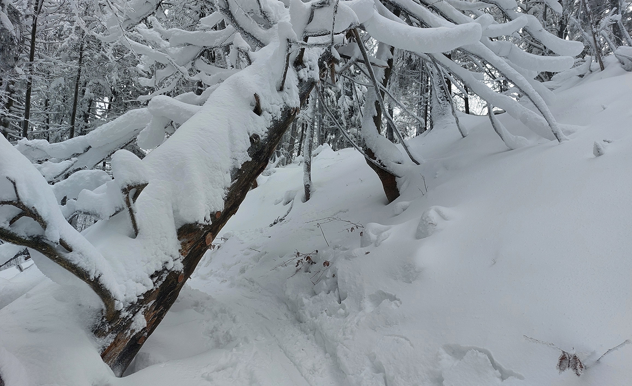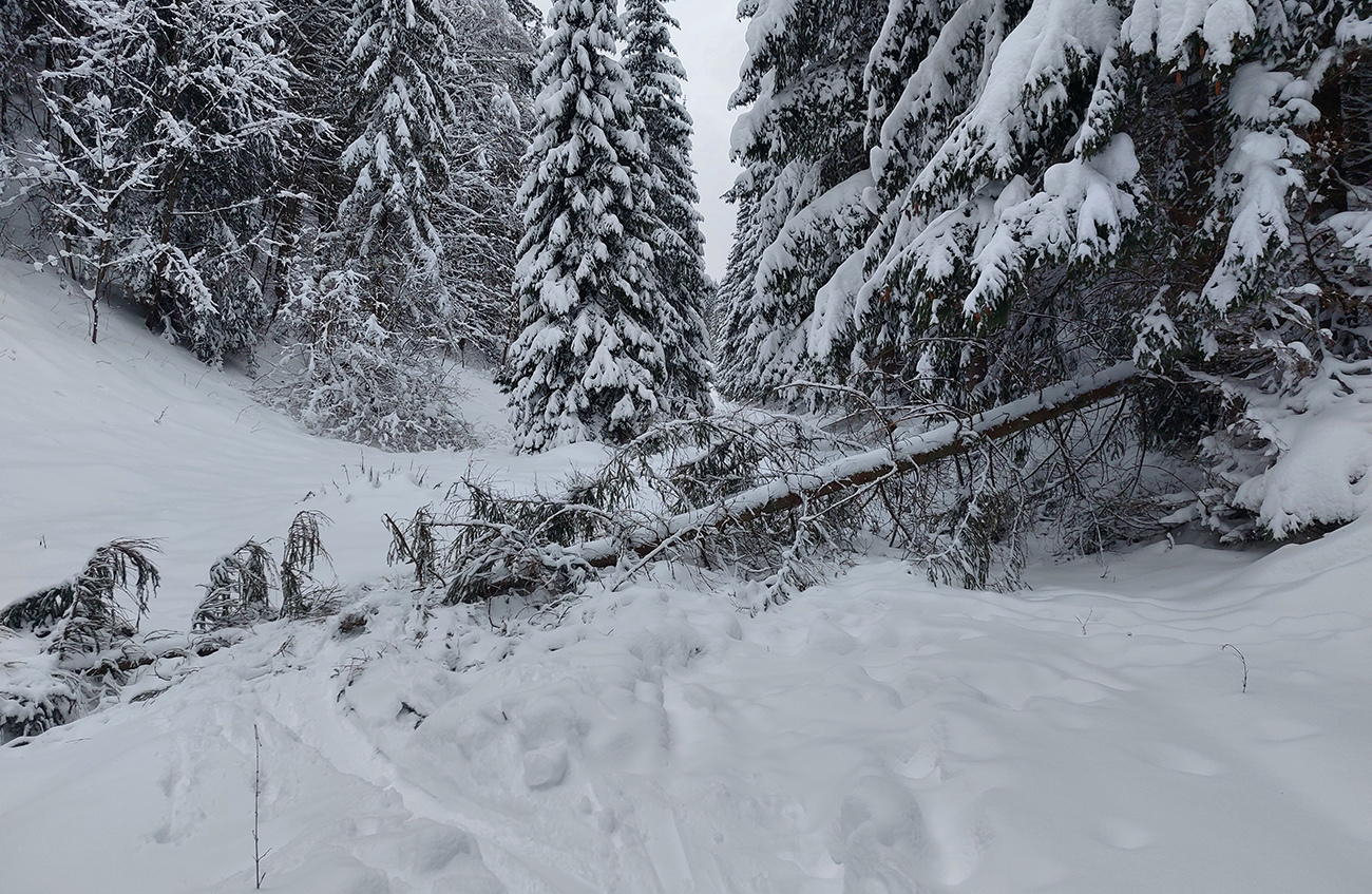 Na serpentíne stopa viedla rovno hore, tak som skúsil doľava, že preleštím cyklotrasu – asi päť cm v noci padlo do prechodenej stopy. Aj tiež jeden statný smrek – tam už to podliezanie také jednoduché nebolo, a ešte na lyžiach. Len také okienko pomedzi vylomené konáre. Inak cesta jedna paráda a okolie ako v zimnej rozprávke.