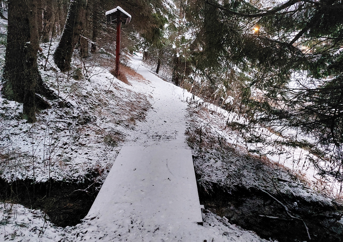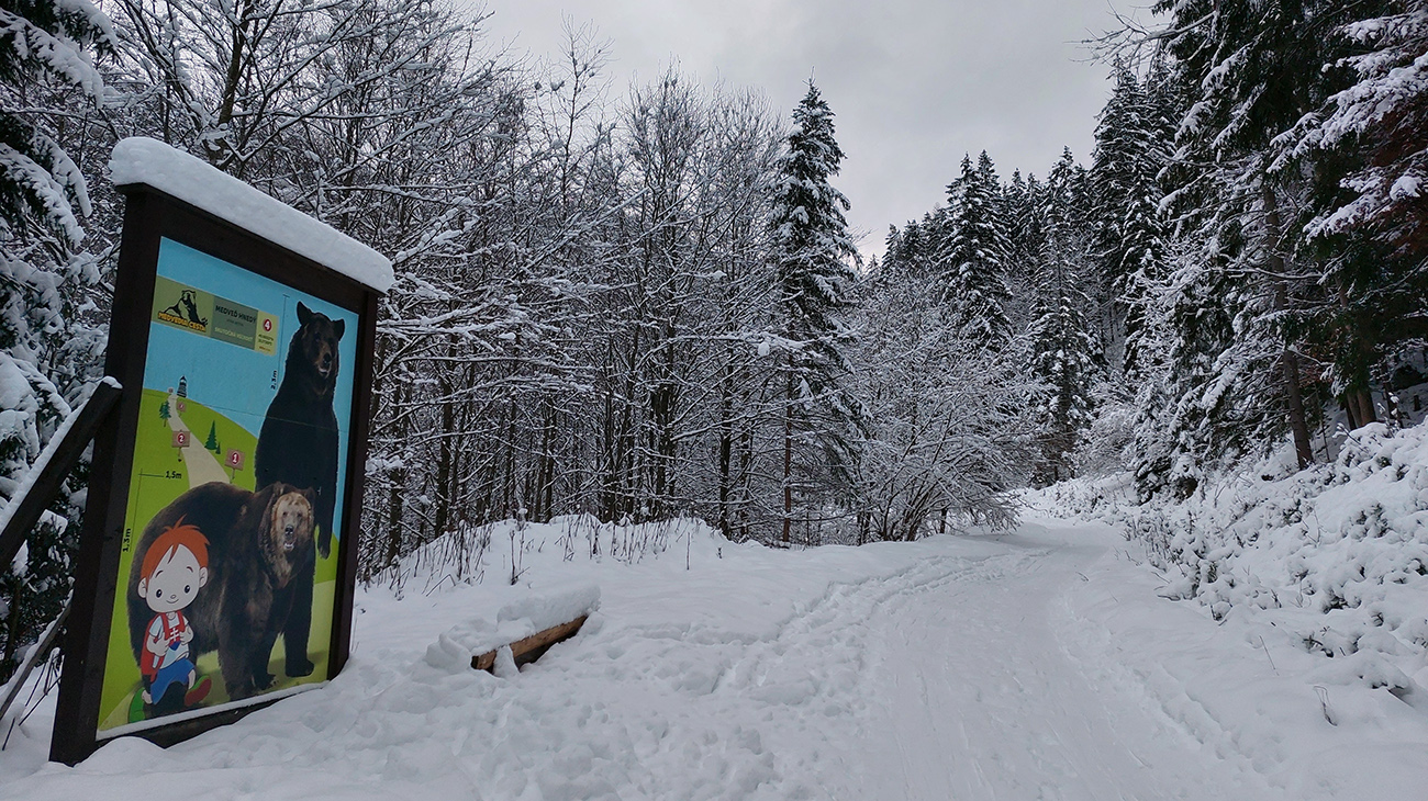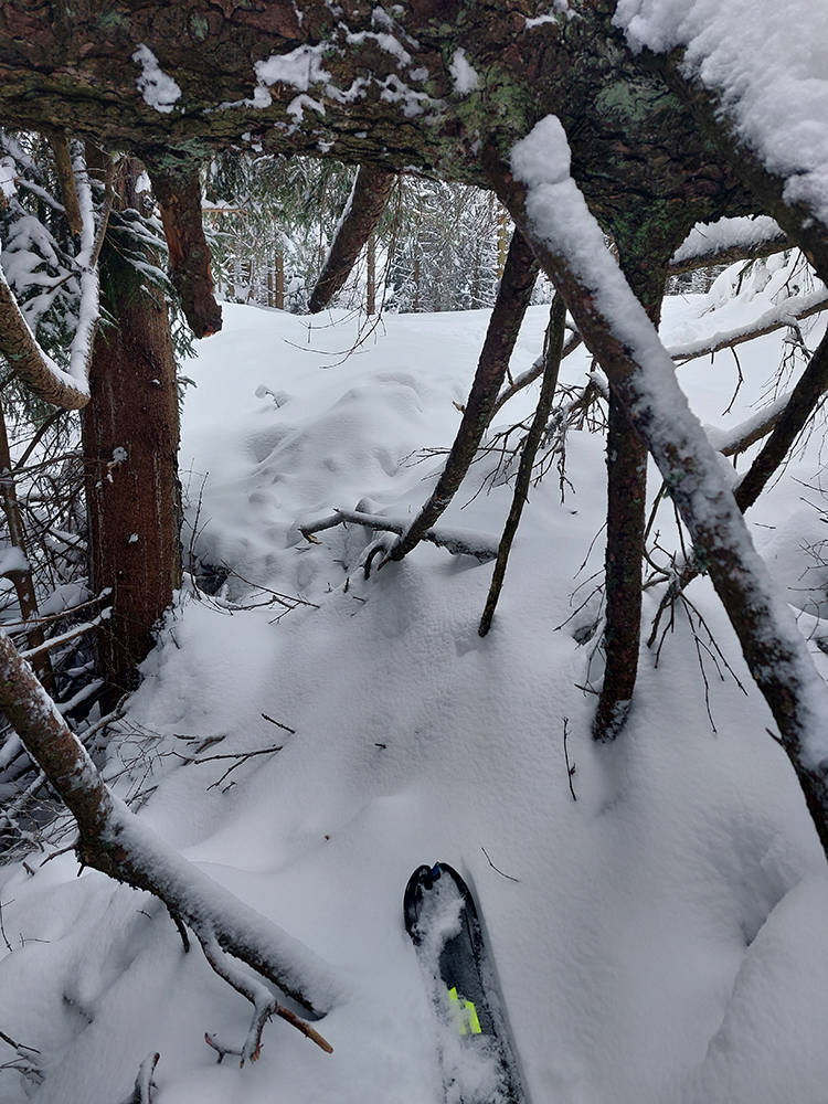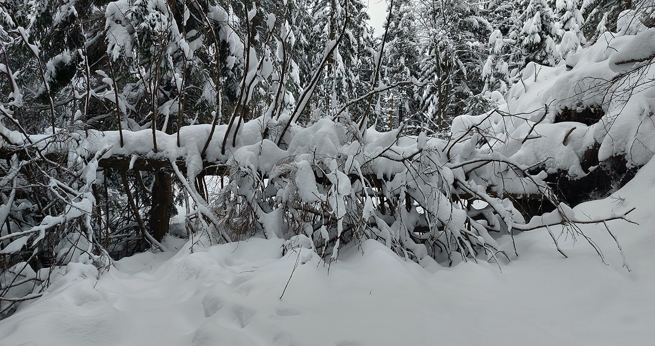 Na serpentíne stopa viedla rovno hore, tak som skúsil doľava, že preleštím cyklotrasu – asi päť cm v noci padlo do prechodenej stopy. Aj tiež jeden statný smrek – tam už to podliezanie také jednoduché nebolo, a ešte na lyžiach. Len také okienko pomedzi vylomené konáre. Inak cesta jedna paráda a okolie ako v zimnej rozprávke.