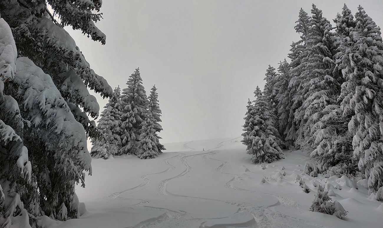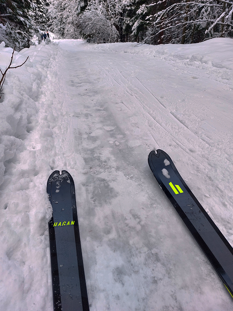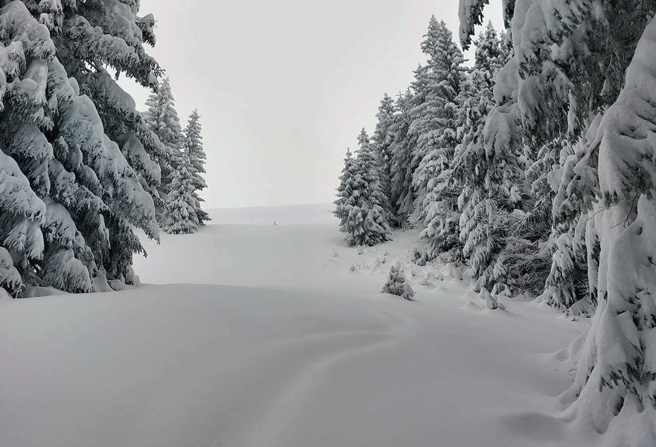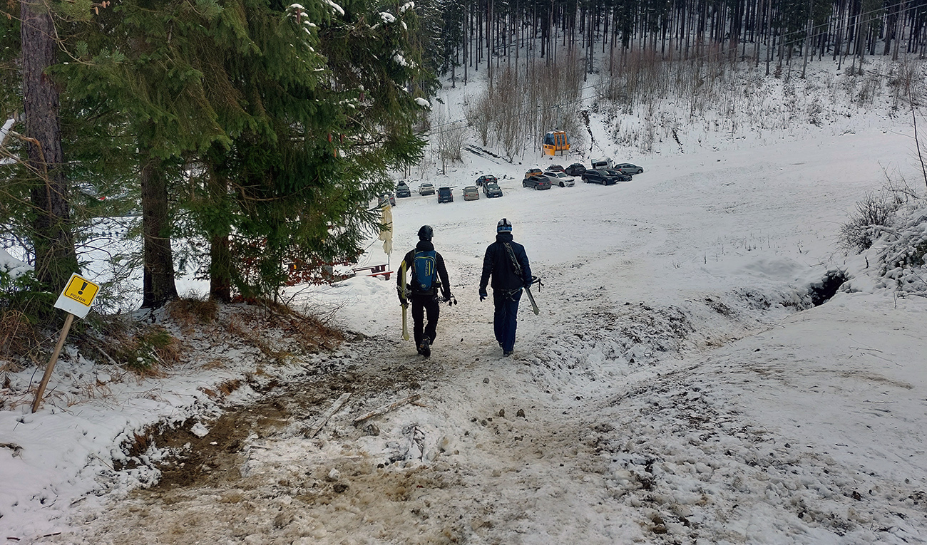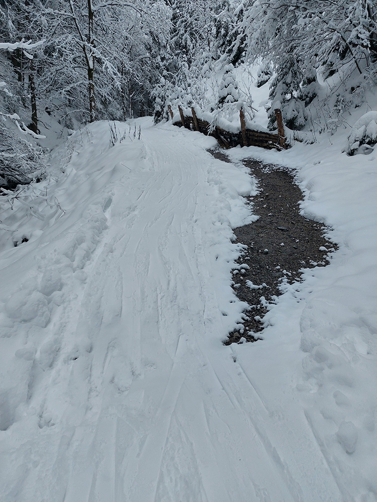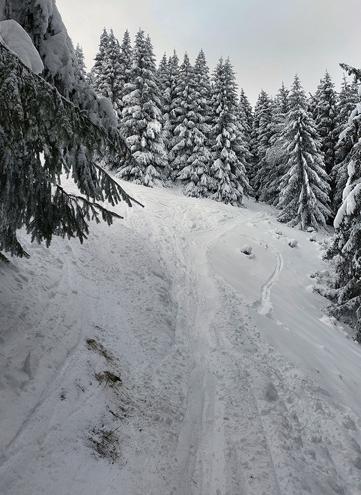 Ešte ostalo času do odjazdu, tak na záver ešte raz hore k lanovke, známym cikcakom lesom. Stopa v čerstvom snehu parádna, hlboká, len pozor! Miestni pretekári ju natiahli ako vždy strmo. Alebo len mojim pásom už končí život?