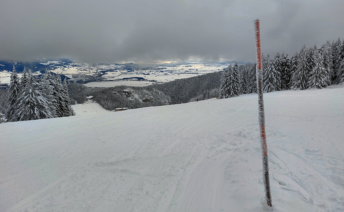 Cestou nazad zmena programu – Vtáčnik už bol pokreslený, pekne natiahnutú stopu smerom hore akurát ničila partia snežničiarov, tak som to otočil popod Nemecký vrch, lesom k lanovke. Stopa už samozrejme natiahnutá, okolo obeda tam už začínalo byť husto, aj smerom dole by sa dalo zlyžovať relatívne bezpečne, nič zákerné tam netrčí. Pri lanovke odliepacie depo plné ako na pretekoch a zjazdovka parádna aj pre ľahké, mäkké lyže.