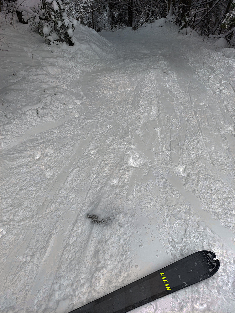 Ráno väčšina stôp odbočovala doľava na Medvediu cestu – a tá je smerom hore čistý komfort a po nočnom snežení aj rozprávka. Len miestami nejaký ten šutrík, treba si dať pozor najmä v strmších úsekoch. Základ? Skoro žiadny, samozrejme trochu biedneho ľadu, popoludní už aj mokroty presvitali na niektorých miestach. Ale zjazdiť sa to dalo aj po okrajoch, „bezpečne a plynulo“.