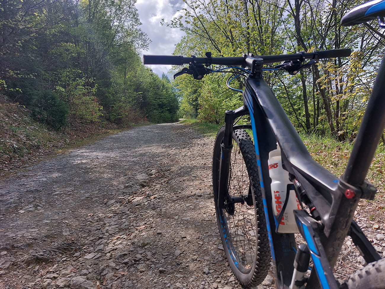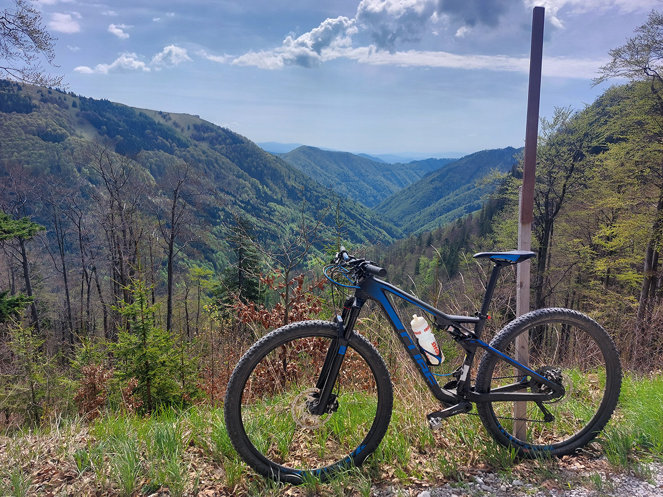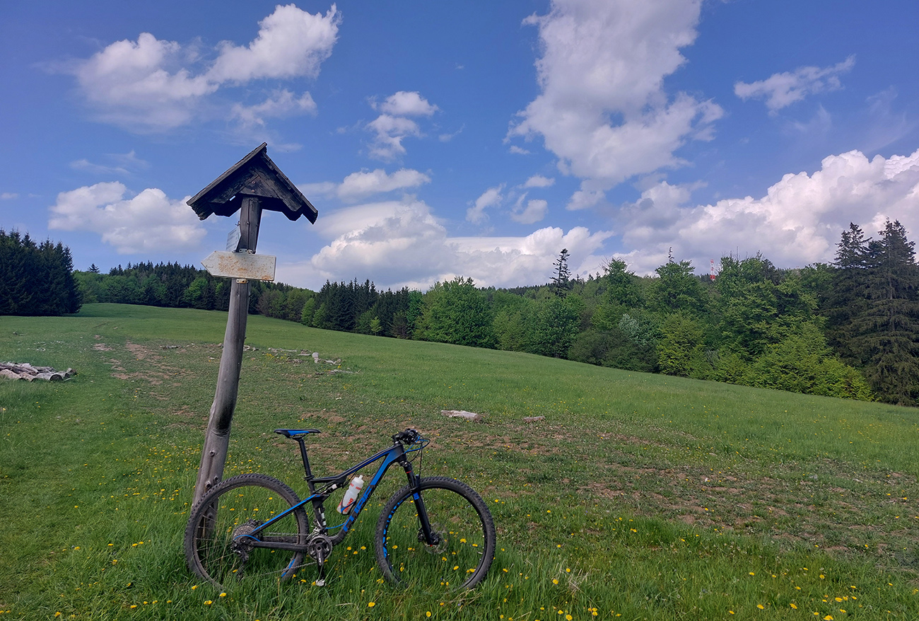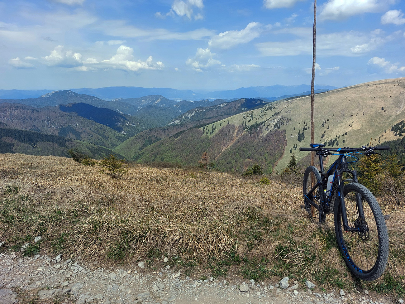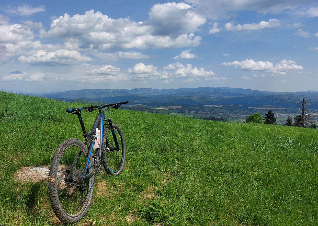 Hore na Krížnu je to už iná stena – a ešte vyerodovaná, aj keď stôp vyjazdených je tu dosť. Po úvodnej strminke za hotelom som preventívne dotankoval v napájadlách, zahryzol sa do riadidiel, zaradil „vyprošťovák“ a davááj hore. Ale nohy ešte silné a stúpanie je tu našťastie prerušované, s rovinkami na predýchanie. Vietor parádny, výhľady ešte lepšie, veď ako na holiach. Len tá technika pomalej jazdy cez šutre nič moc, trochu aj drina miestami.