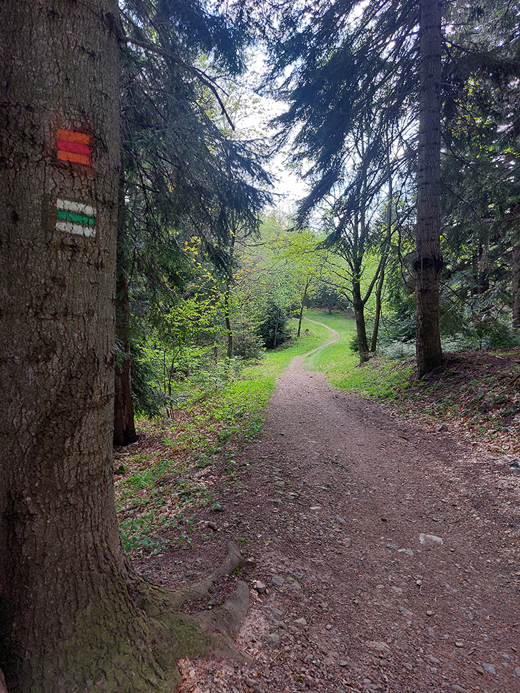 Pri horárni doľava po žltej cykloznačke, do lesných traverzov, po spevnenej hlino-šotoline, až hore, ku zvyškom Špaňodolinského vodovodu, ktorý „stráži“ drevený žliabkar Matiáš. Stúpanie len o trochu dlhšie ako predošlé, tiež veľmi pohodlné a krajinársky pekné, ak sú nohy – a tie moje už začínali pišťať. Holt, to aj trénovať treba. Ale dobre, to už bol posledný dlhší výšľap.
