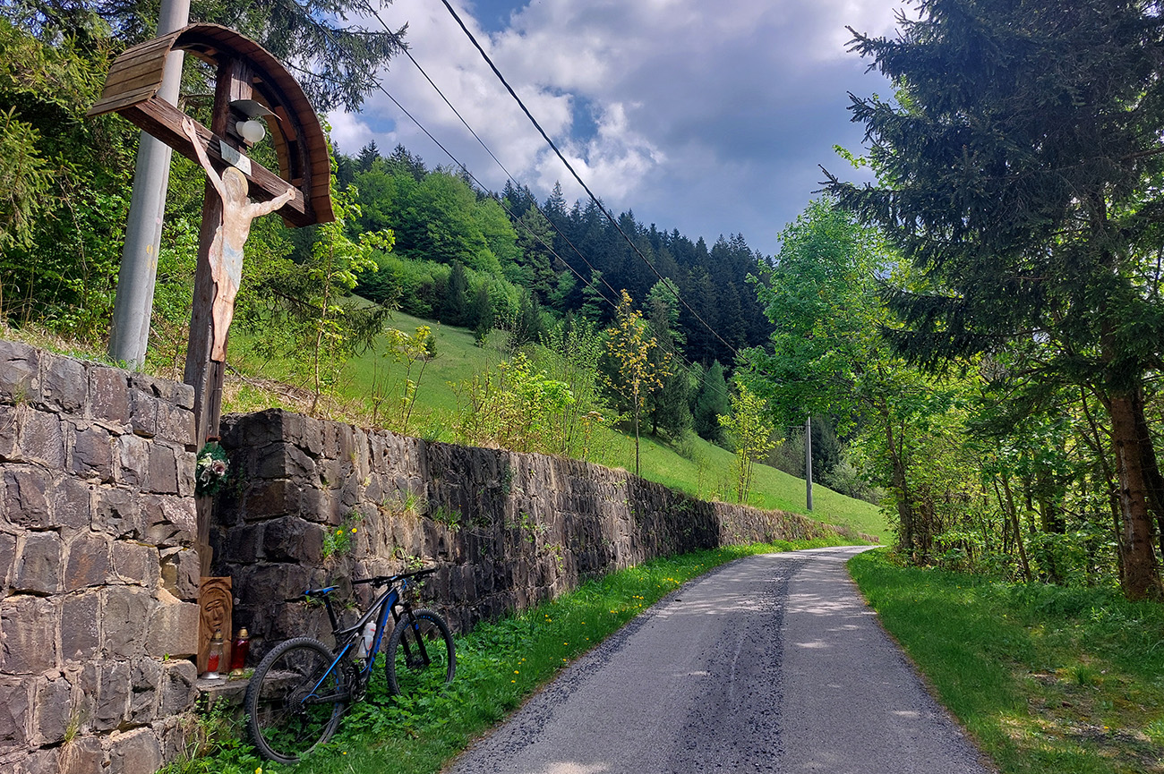 Lenivosť vyhrala, spustil som sa doprava, nech som čím skôr preč z rušnej cesty. Stúpanie popri elektrárni a pomedzi staré chalupy a socialistické chaty je potom plynulé, po asfalte až ku starej horárni na križovatke cyklotrás.