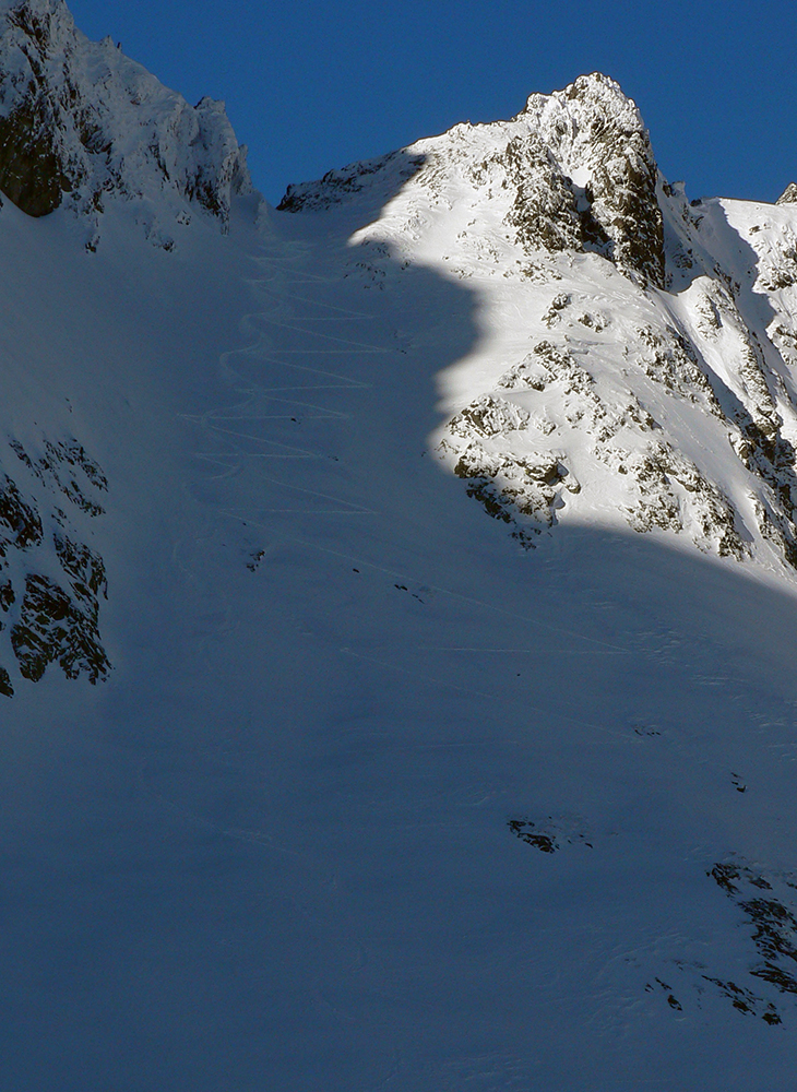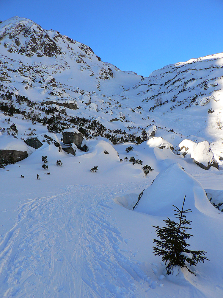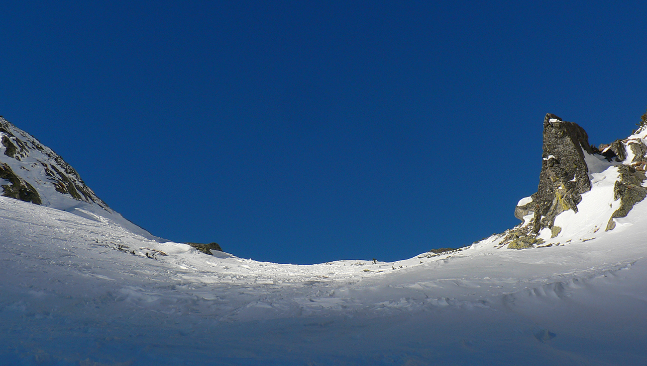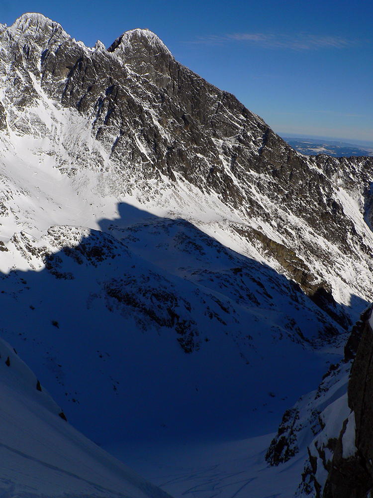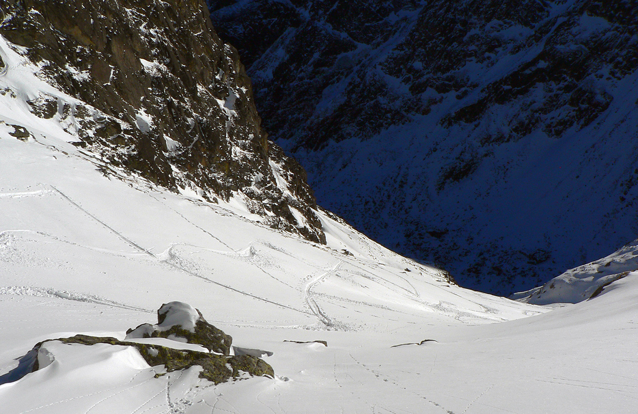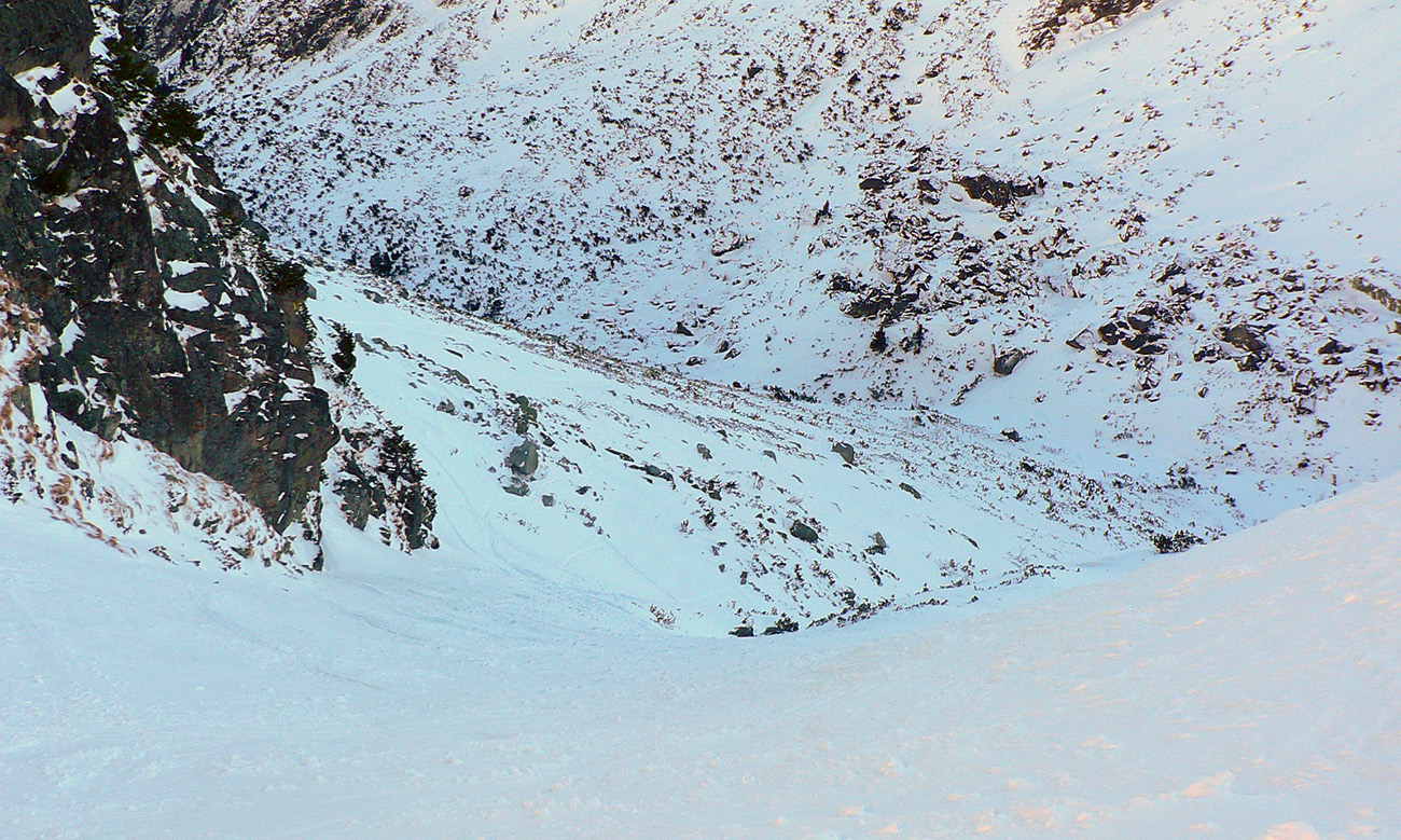 Takže ako prvý Prielom, celý v hlbokom tieni: stopa natiahnutá, ale zafúkaná, najmä v dolnej časti. A nie až hore – predchodca zrejme usúdil, že ten vrcholový prevej nie je moc bezpečný a ja som súhlasil. A mal som to za odmenu, nechcelo sa mi predupávať v tom kvante snehu, bola by to drina. Lyžovačka slušná, v hutnom, ufúkanom prašane, žraloky nehrýzli, len dole bolo treba na niektorých miestach zopatrnieť.