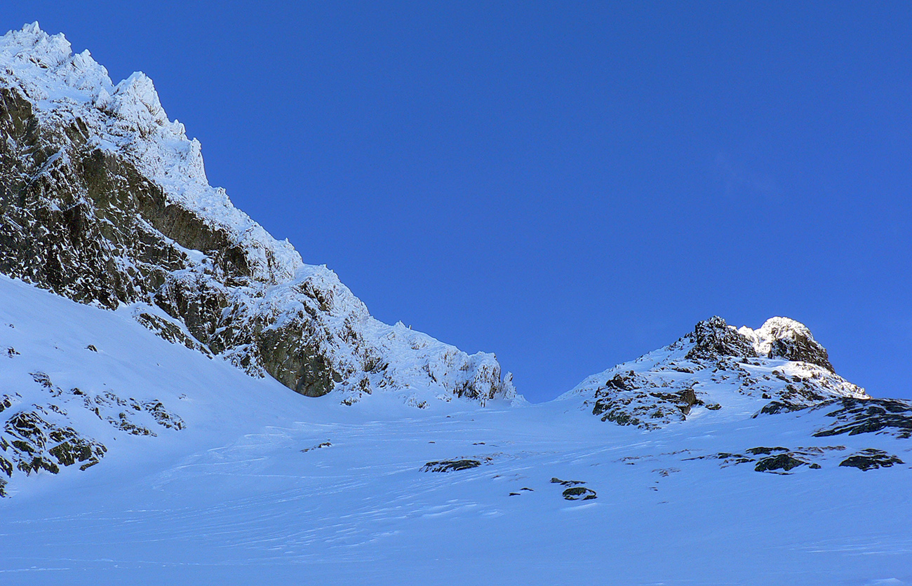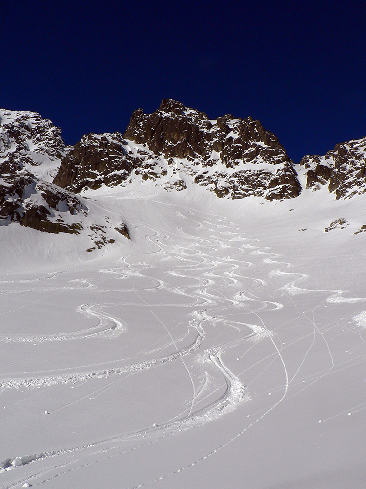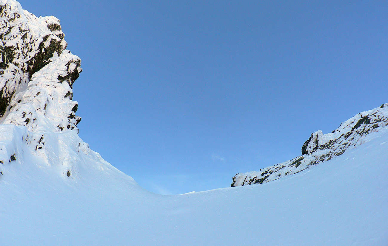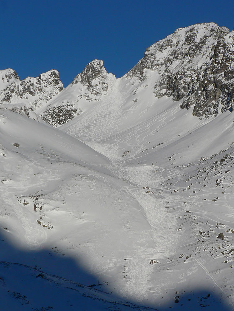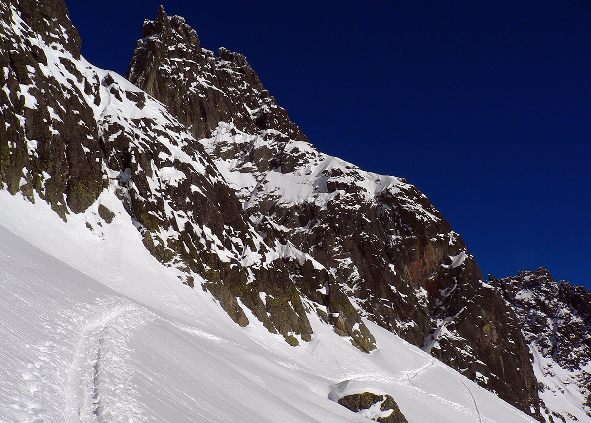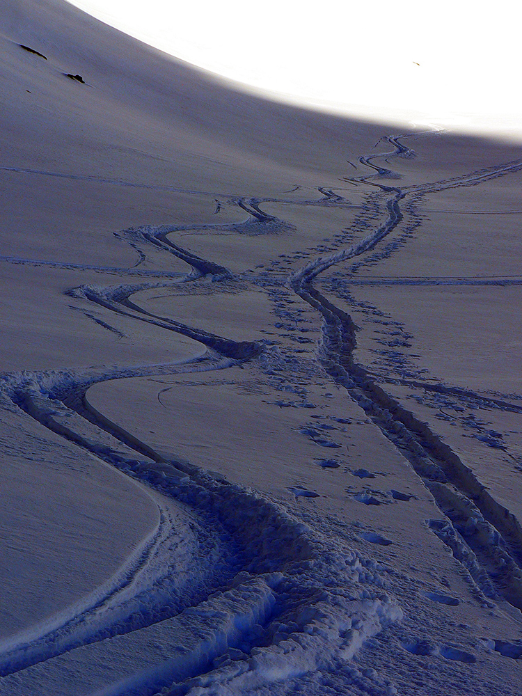 Takže ako prvý Prielom, celý v hlbokom tieni: stopa natiahnutá, ale zafúkaná, najmä v dolnej časti. A nie až hore – predchodca zrejme usúdil, že ten vrcholový prevej nie je moc bezpečný a ja som súhlasil. A mal som to za odmenu, nechcelo sa mi predupávať v tom kvante snehu, bola by to drina. Lyžovačka slušná, v hutnom, ufúkanom prašane, žraloky nehrýzli, len dole bolo treba na niektorých miestach zopatrnieť.
