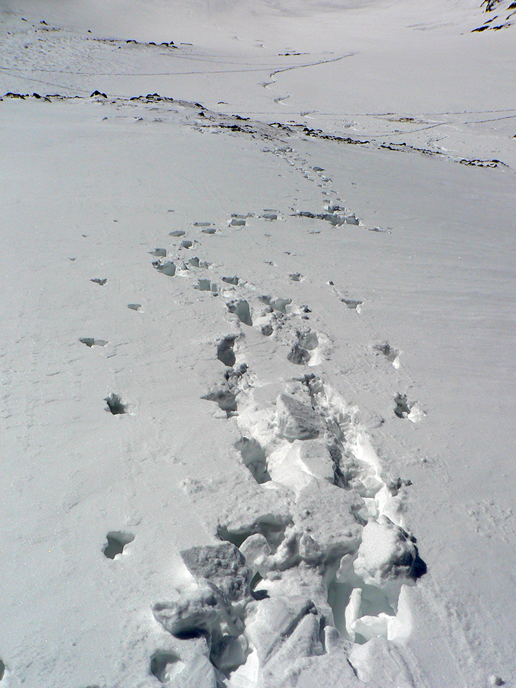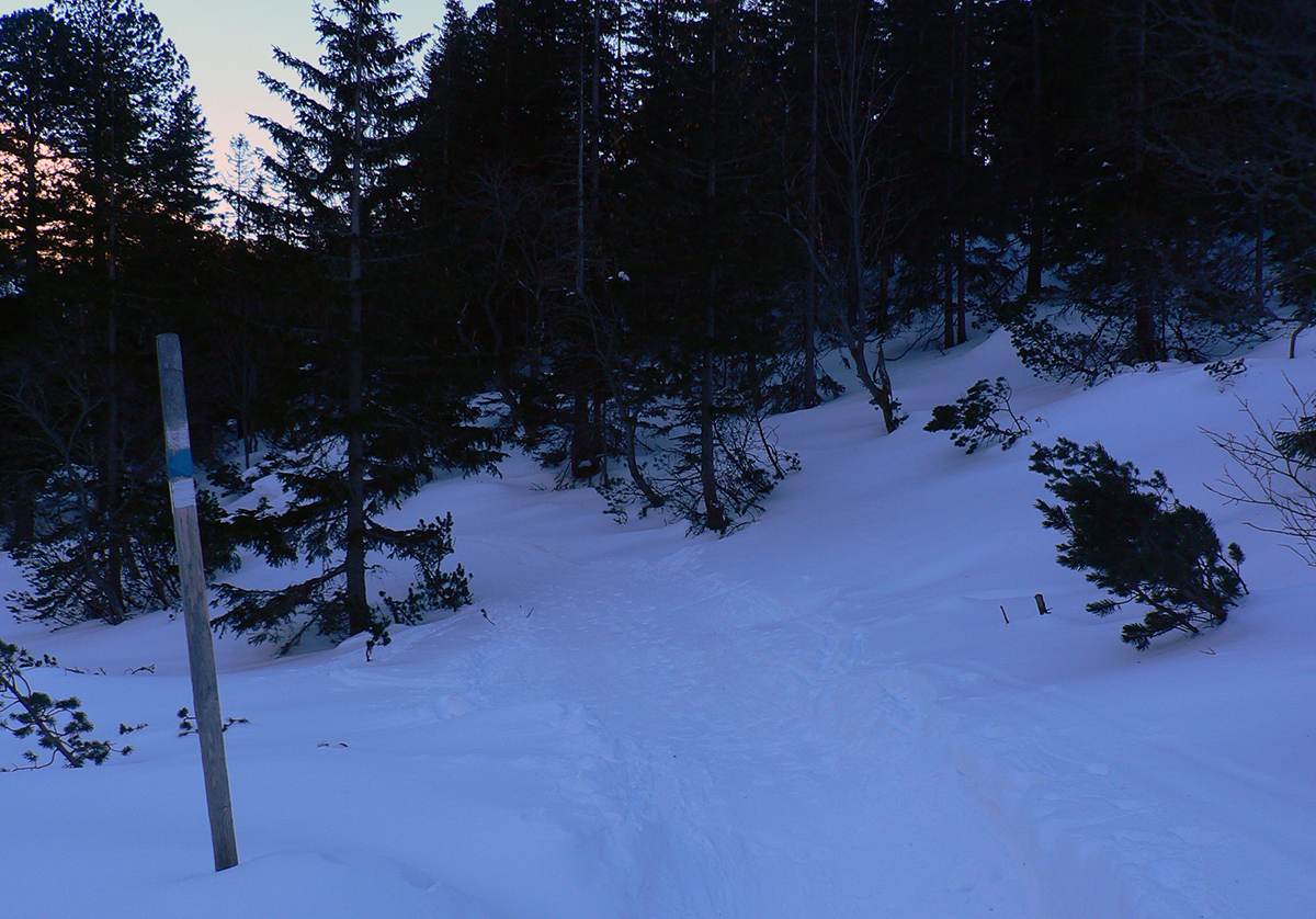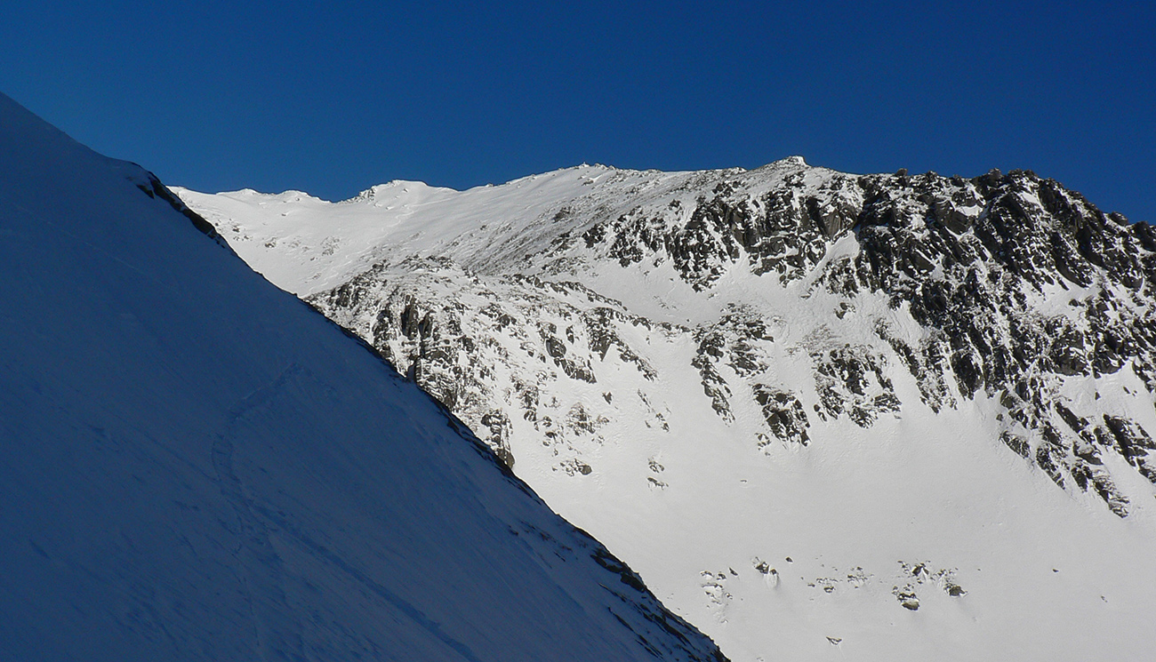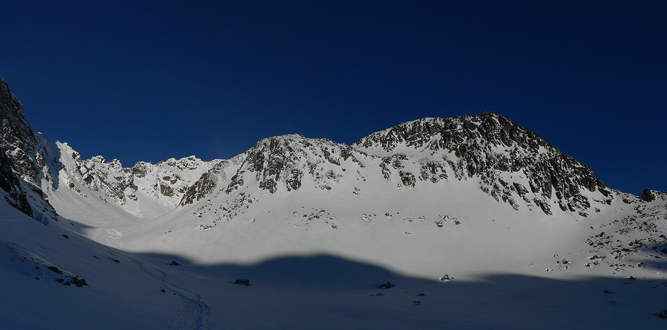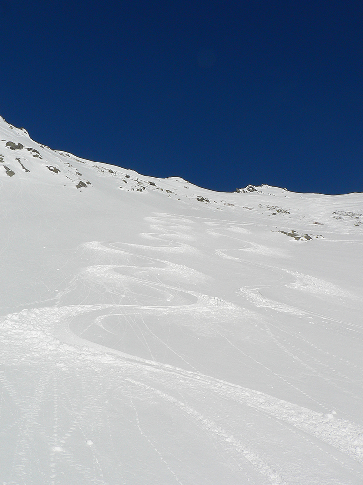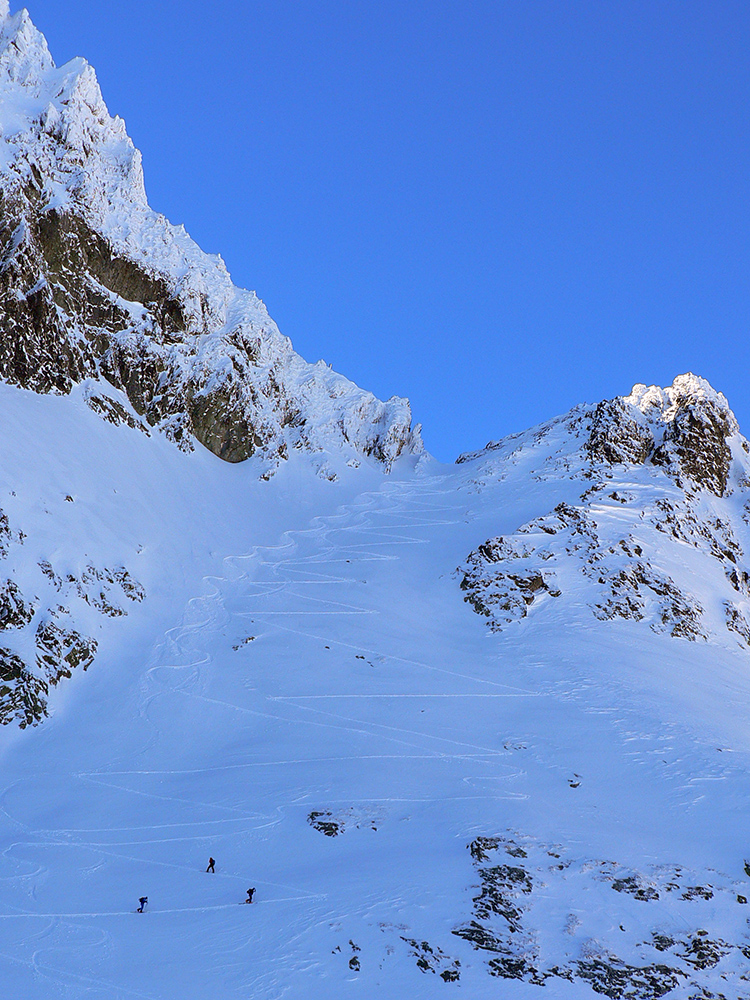 Takže ako prvý Prielom, celý v hlbokom tieni: stopa natiahnutá, ale zafúkaná, najmä v dolnej časti. A nie až hore – predchodca zrejme usúdil, že ten vrcholový prevej nie je moc bezpečný a ja som súhlasil. A mal som to za odmenu, nechcelo sa mi predupávať v tom kvante snehu, bola by to drina. Lyžovačka slušná, v hutnom, ufúkanom prašane, žraloky nehrýzli, len dole bolo treba na niektorých miestach zopatrnieť.