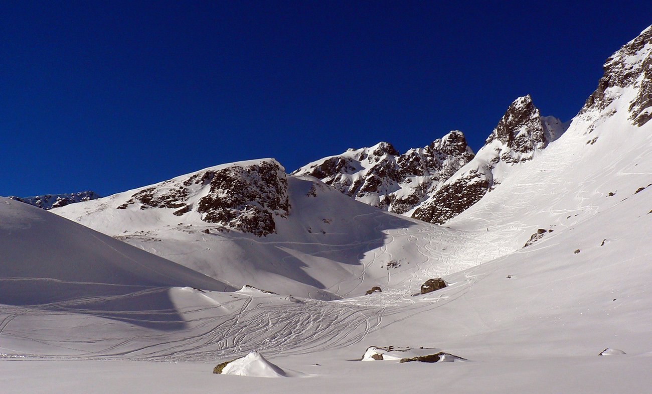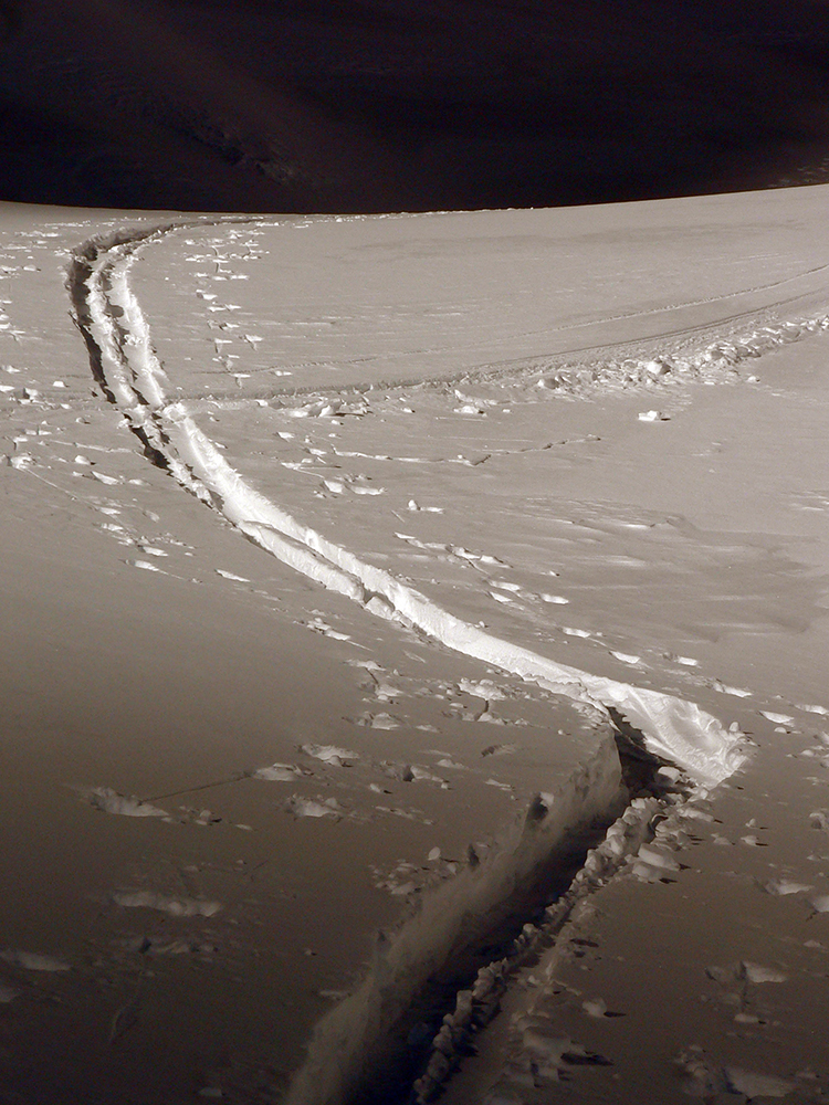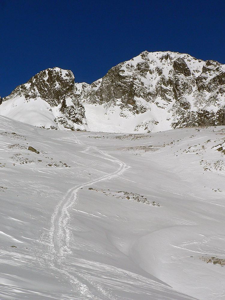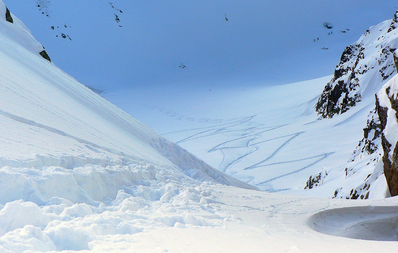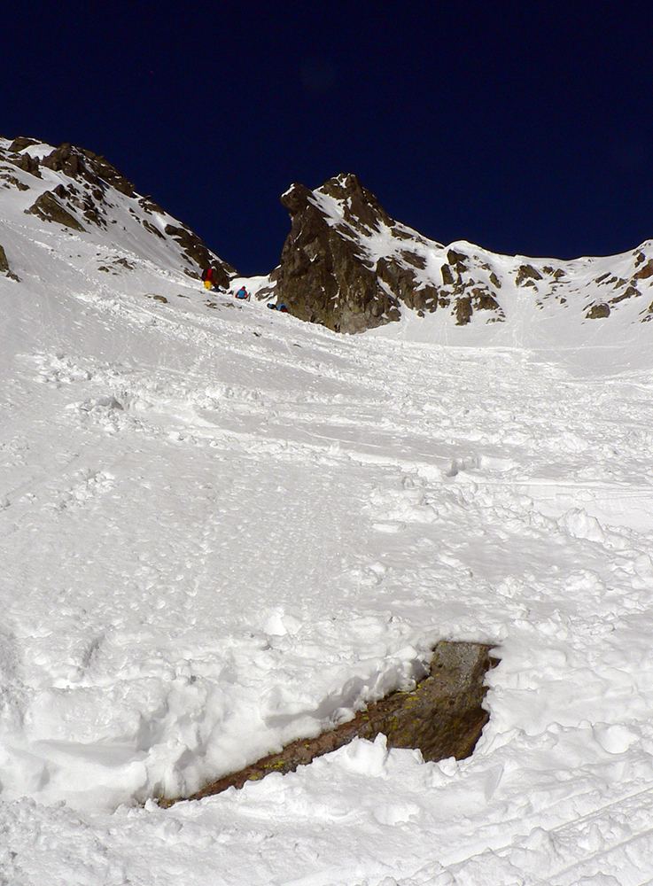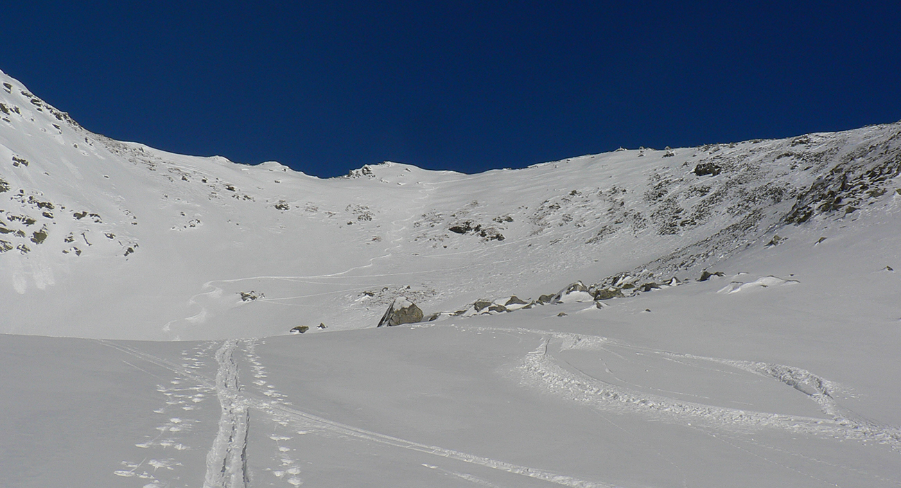 Takže ako prvý Prielom, celý v hlbokom tieni: stopa natiahnutá, ale zafúkaná, najmä v dolnej časti. A nie až hore – predchodca zrejme usúdil, že ten vrcholový prevej nie je moc bezpečný a ja som súhlasil. A mal som to za odmenu, nechcelo sa mi predupávať v tom kvante snehu, bola by to drina. Lyžovačka slušná, v hutnom, ufúkanom prašane, žraloky nehrýzli, len dole bolo treba na niektorých miestach zopatrnieť.