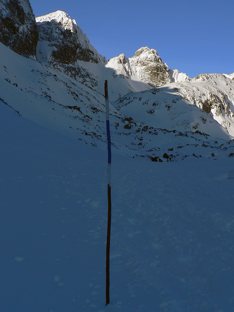 Svišťový štít ako druhý – prechod na slnko poriadne ostrý, aj teplotne. Vo svahu aj hore máličko snehu, aj problém vyjsť to celé na pásoch, v strede medzi tým ale naviate brucho a prebáračka do pol stehien. Zlyžovať sa dalo jediným miestom, ale aj tam som bol radšej opatrný. Napriek tomu to raz aj zaškrípalo spod hladiny. Bez následkov, našťastie. Pár plynulých oblúkov len v prášku smerom von z kotla, popri výstupovej stope.