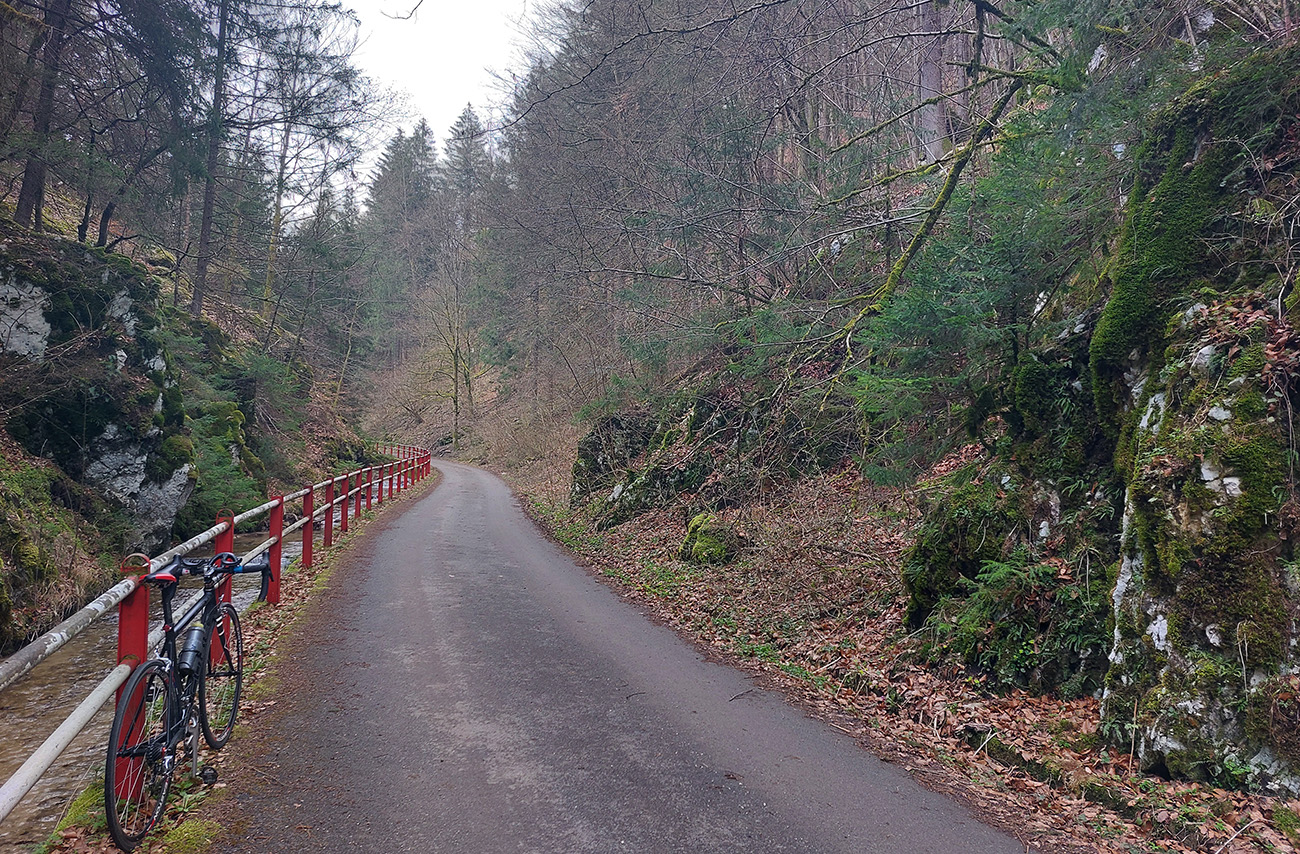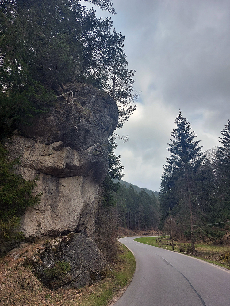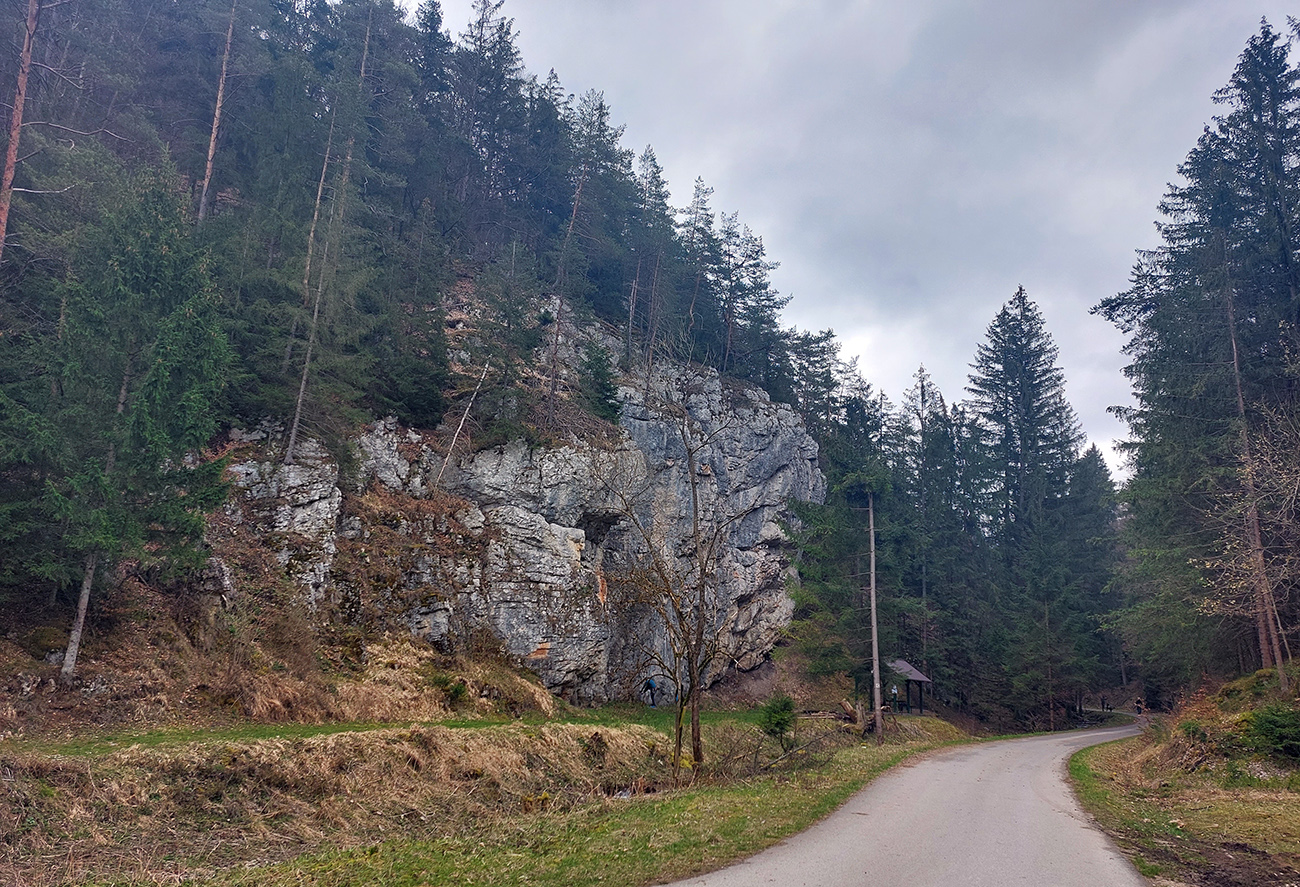 Dolinka pekná, pomedzi stále holé stromy pekné výhľady na bralnaté svahy. Zimný posyp na ceste ešte v hojných množstvách síce, ale zo stopy vyhádzaný autami, no proste paráda! Takéto cesty, čím po nich človek ide hlbšie do lesa, tým sú horšie, tu ale presne naopak – a dokonca posledný, superstrmý kilometer pod Mojtínom čisto nová cesta. Len bolo treba kolesá správne smerovať, kolmo cez široké odtokové jarky :-) Ako bonus ale nádherné skalné steny nad hlavou, no radosť sa trápiť. Lebo na tých 18% (podľa značky) mi zúfalo chýbali prevody, ale najmä nohy.