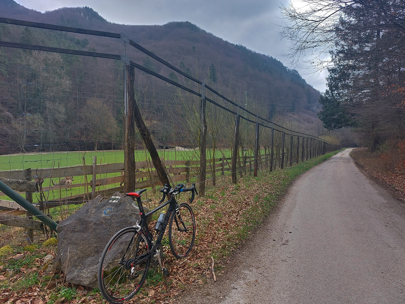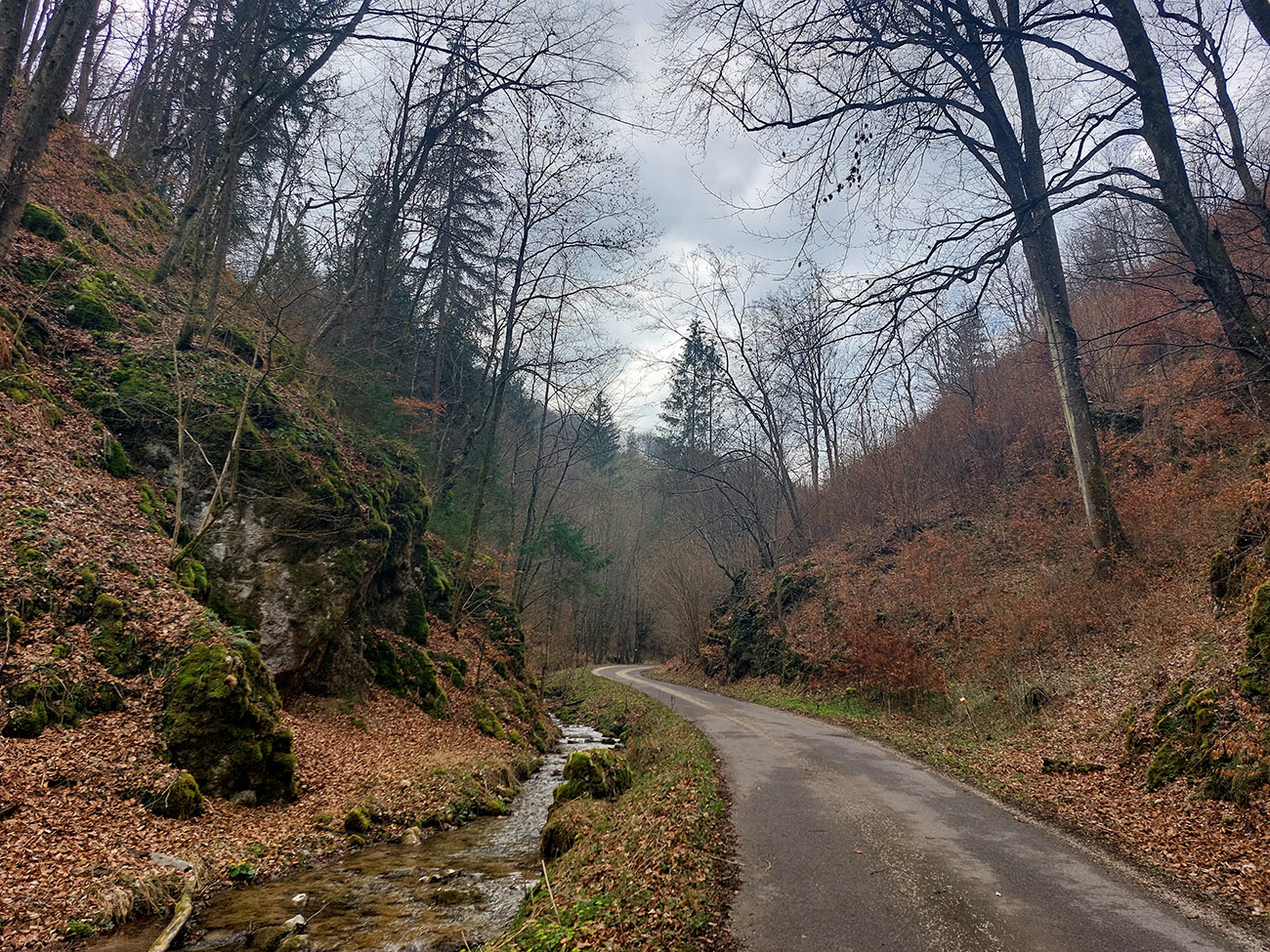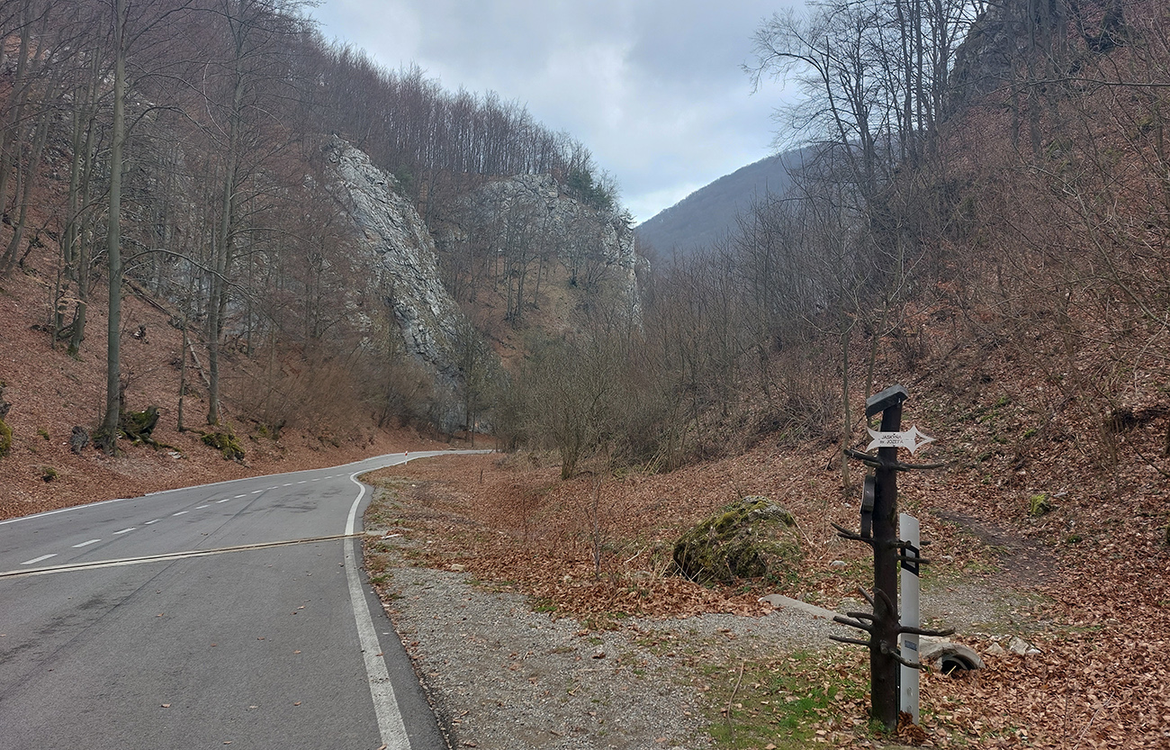Dolinka pekná, pomedzi stále holé stromy pekné výhľady na bralnaté svahy. Zimný posyp na ceste ešte v hojných množstvách síce, ale zo stopy vyhádzaný autami, no proste paráda! Takéto cesty, čím po nich človek ide hlbšie do lesa, tým sú horšie, tu ale presne naopak – a dokonca posledný, superstrmý kilometer pod Mojtínom čisto nová cesta. Len bolo treba kolesá správne smerovať, kolmo cez široké odtokové jarky :-) Ako bonus ale nádherné skalné steny nad hlavou, no radosť sa trápiť. Lebo na tých 18% (podľa značky) mi zúfalo chýbali prevody, ale najmä nohy.