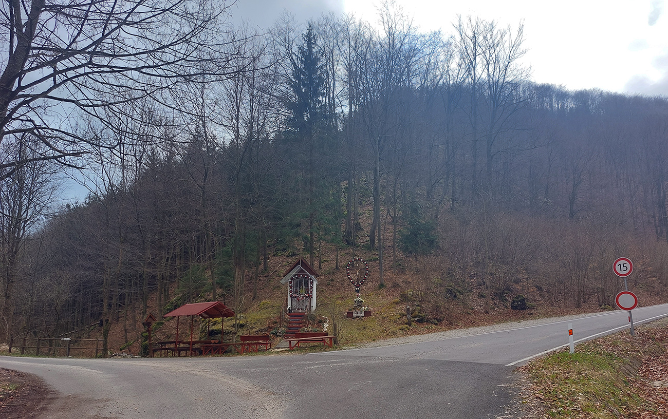 Na križovatke pod Priedhorím podobné lákadlo ako skôr (pod Mojtínom): aj tu vyzerá cesta ďalej dolinou použiteľná, tak som neodolal. Asfalt už je tu síce taký postarší, miestami poriadne vymrvený, ale veď čo? Cestou dole viac pribrzdím. V doline, na ceste aj na svahoch, už je viac stôp po ťažbe dreva, ale stále komfort, aj je čo obzerať. A od rázcestia Pod Hrádkom sa podklad aj tu radikálne vylepšuje, tak som potiahol komfortne pod sedlo Samostrel a otočil to pri kaplnke pod lúkami. Dá sa potiahnuť ešte trošku vyššie na lúku, ale tam už sú len zvyšky asfaltu. Cestou dole znovu viac priestoru na obzeranie skalných stien, a ani som nemusel tak moc brzdiť, ako som si myslel, že budem musieť :-)
